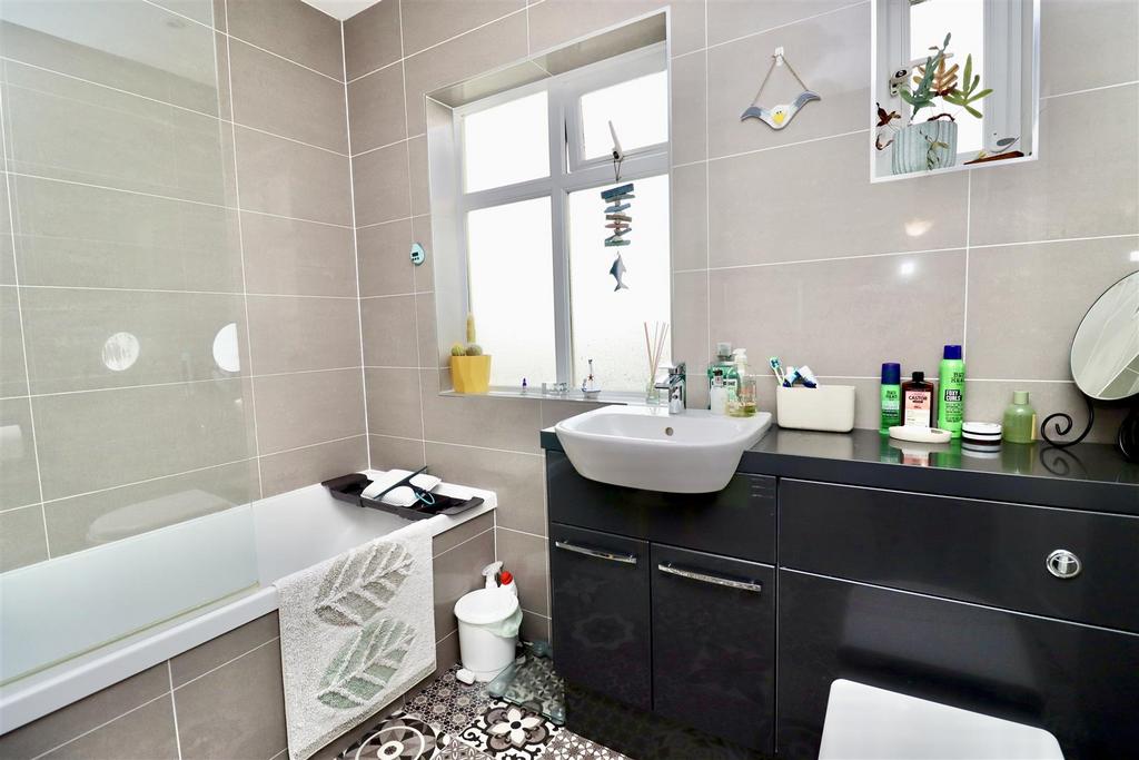 Bathroom - 2.51m x 1.90m (8'2" x 6'2") - Refurbished fitted suite comprising bath with mixer taps, low flush WC, vitra vanity hand basin, fully tiled walls, chrome heated towel rail, recess lighting, tiled flooring and walls and two double glazed window to the side elevation.