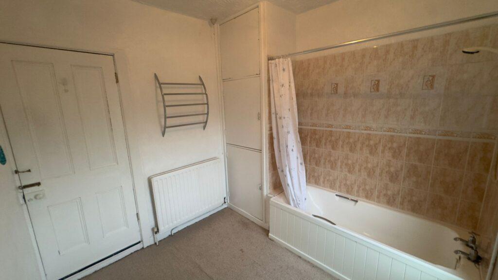 BATHROOM - Also on the first floor is the characteristic bathroom, with light brown carpet and neutral partially tiled walls. The room consists of a W/C, wash basin, and bath/shower combination, as well as a towel rail, built-in storage cupboards and frosted window.