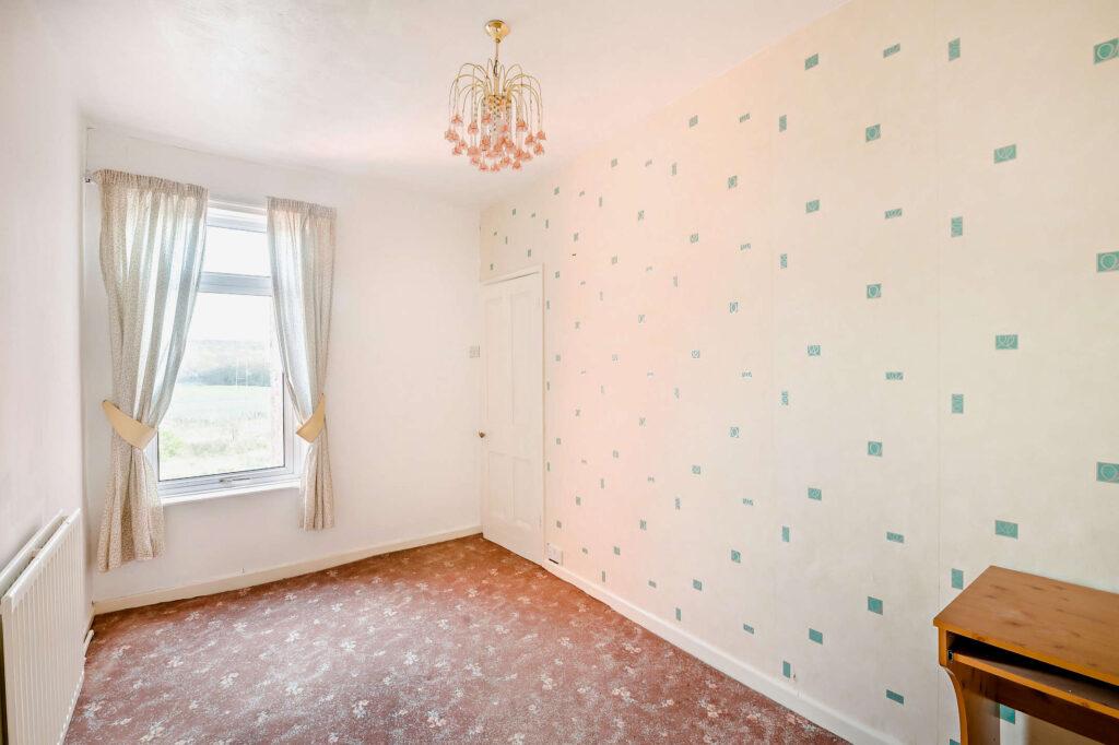 Bedroom 1: Up the stairs in the entrance hall are two bedrooms, the first of which is the largest. With soft beige carpet and neutral wallpaper, this room is bright and airy thanks to two large windows. There is plenty of space for a double bed and additional furniture of your choice, and a large wardrobe unit with mirrors and drawers takes up the left wall.