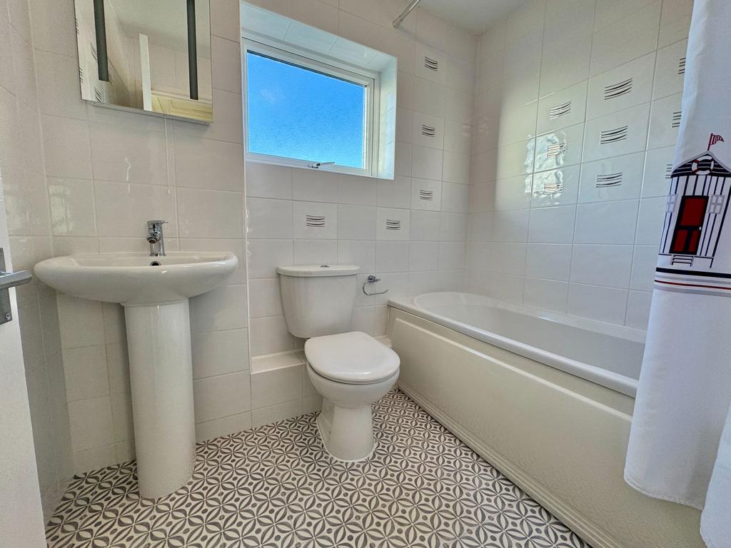 Matching suite comprising, a panelled bath with mixer tap and shower attachment, low level WC, pedestal wash hand basin, fully tiled walls, heated towel rail, PVCu double glazed frosted window to the side.