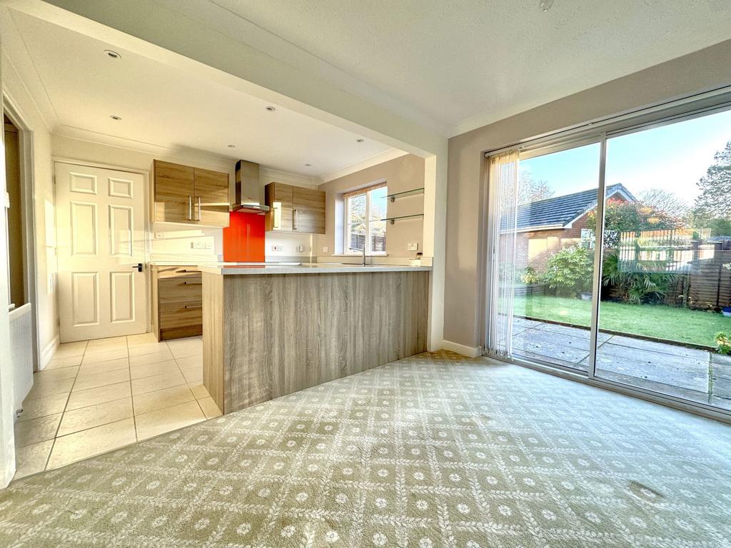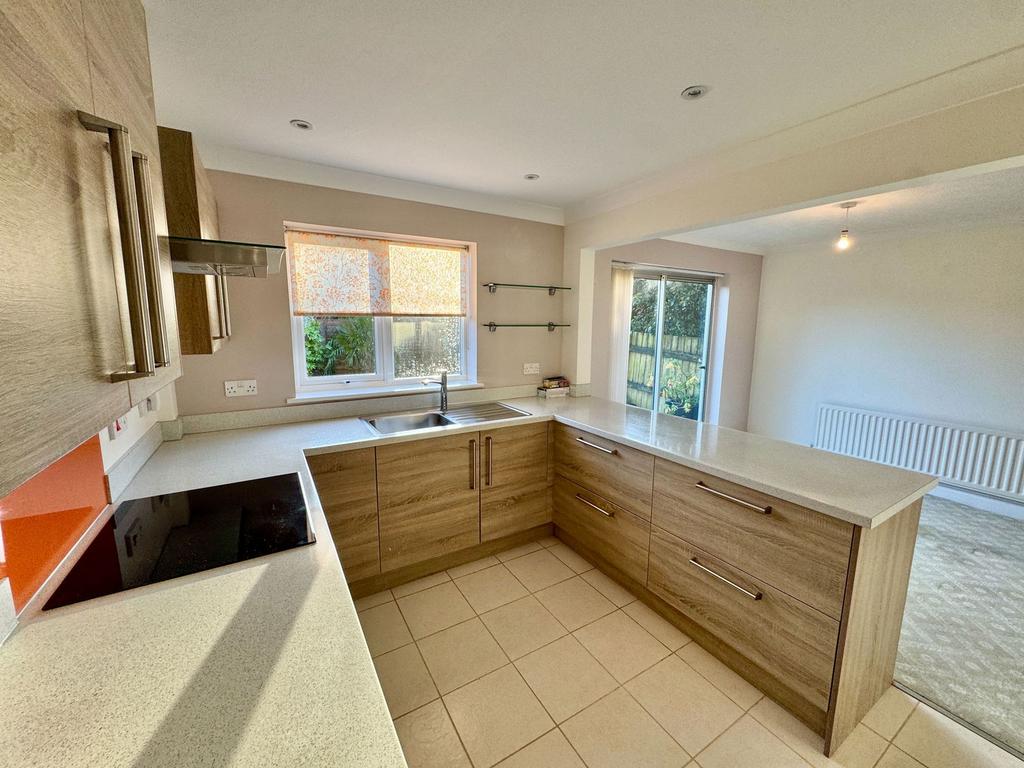 Roll edge worksurfaces with cupboard and drawers under and matching wall units, single drainer stainless steel sink unit with mixer tap, built in electric oven and four ring induction hob, extractor hood, tiled floor, PVCu double glazed window overlooking the rear garden and door to utility area, access to the dining area, aluminium double glazed sliding patio door to the rear garden and two radiators.