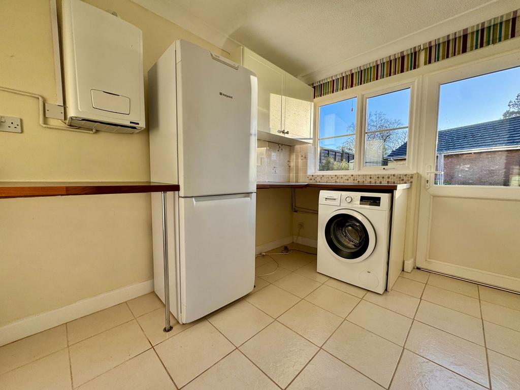 Roll edge worksurfaces, built in wall units, plumbing for washing machine, wall mounted gas boiler which serves domestic hot water and central heating system, PVCu double glazed window and door to the rear garden and door to the garage.