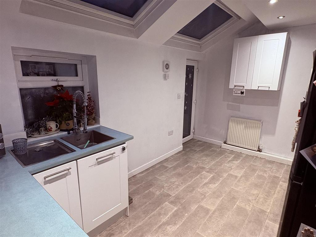 Dining Kitchen - Modern white high gloss kitchen having a range of wall and base units incorporating stainless steel sink unit & drainer, electric oven, induction hob, extractor, plumbing for auto washer, radiator and upvc door leading to rear garden.