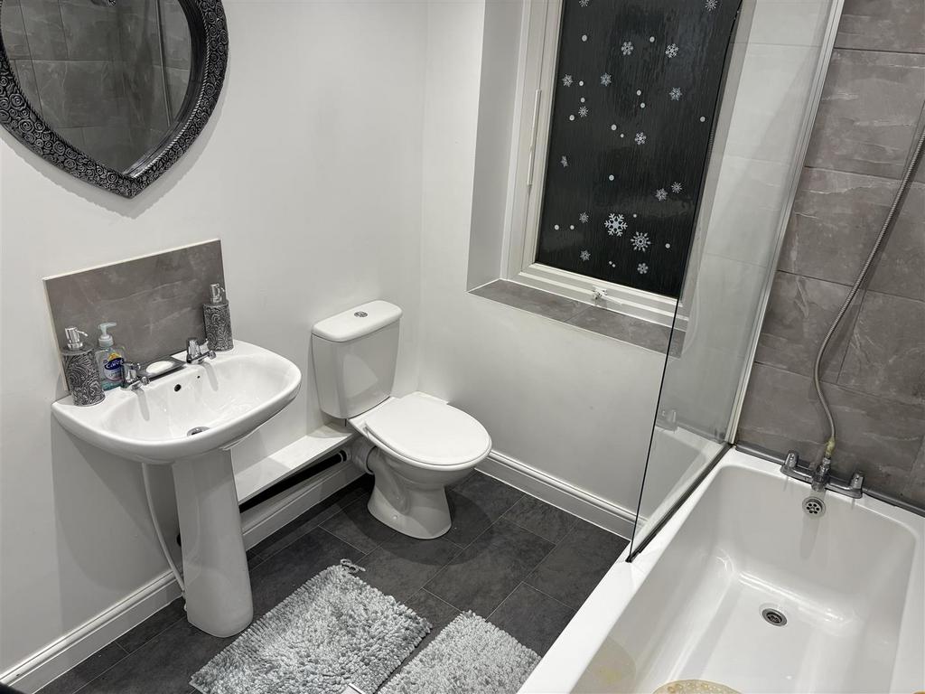 Bathroom - Modern three piece suite comprising panel bath with shower over & screen, low flush wc, pedestal wash basin and radiator.