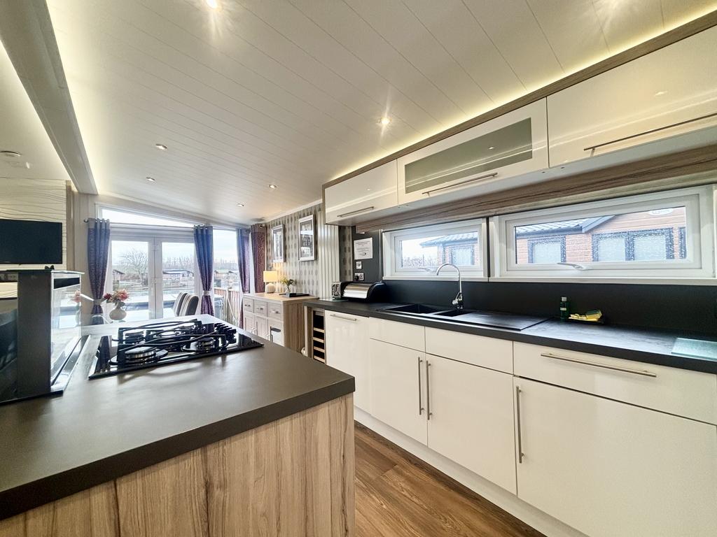 This luxurious two-bedroom holiday home is designed for supreme comfort and style. The spacious, open-plan living area features high-quality furnishings, a modern kitchen with integrated appliances, and large patio doors that lead directly onto an expansive, private decking area, perfect for enjoying the tranquil water views.