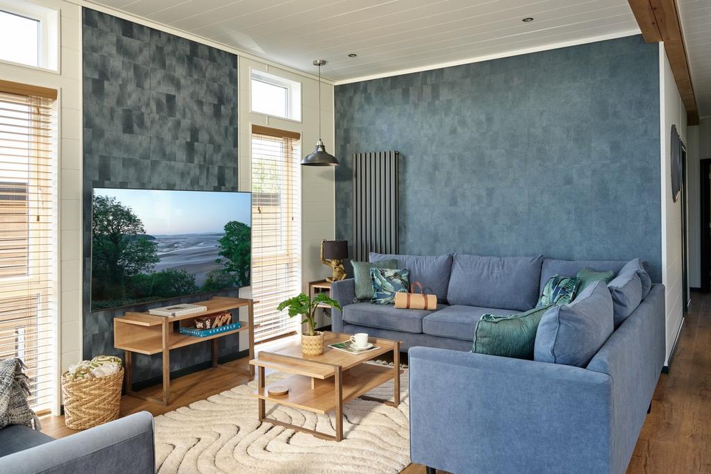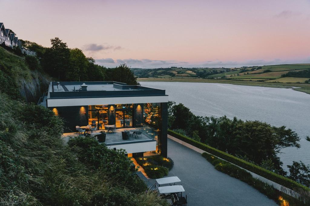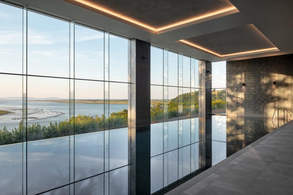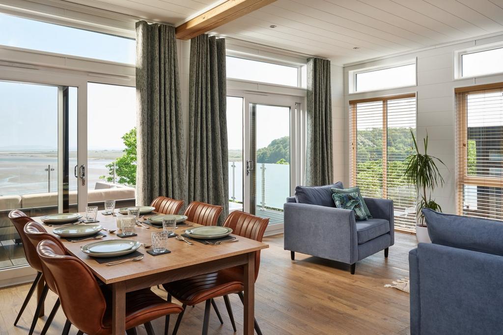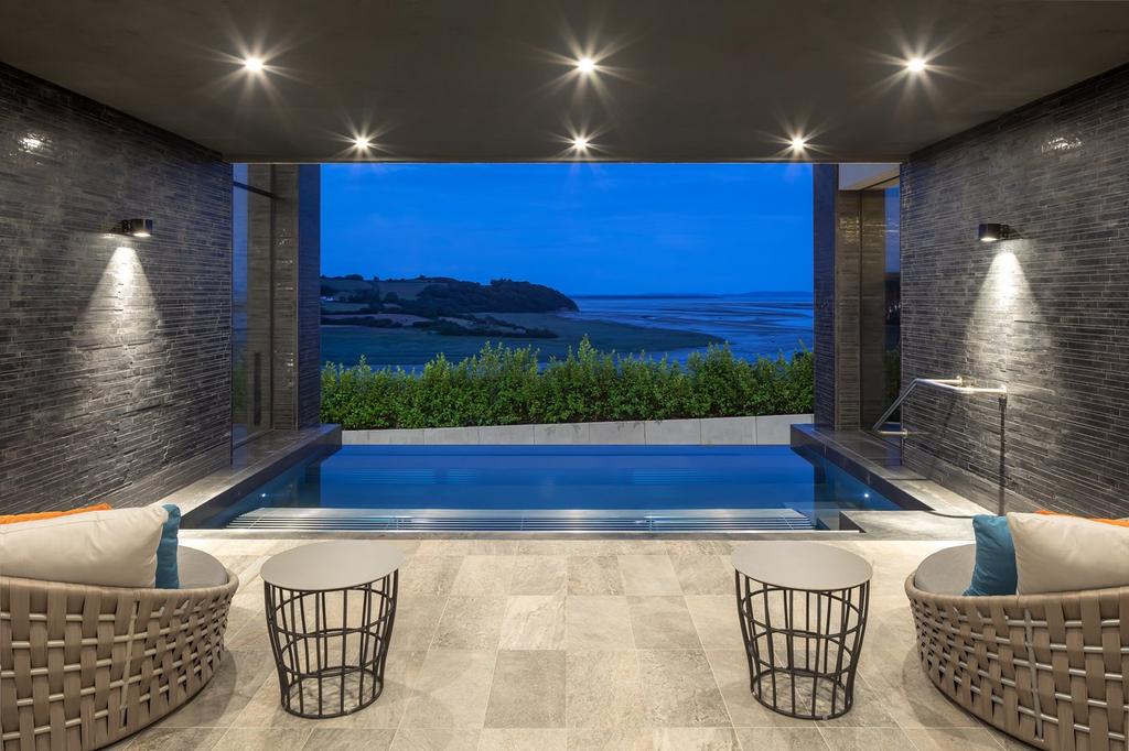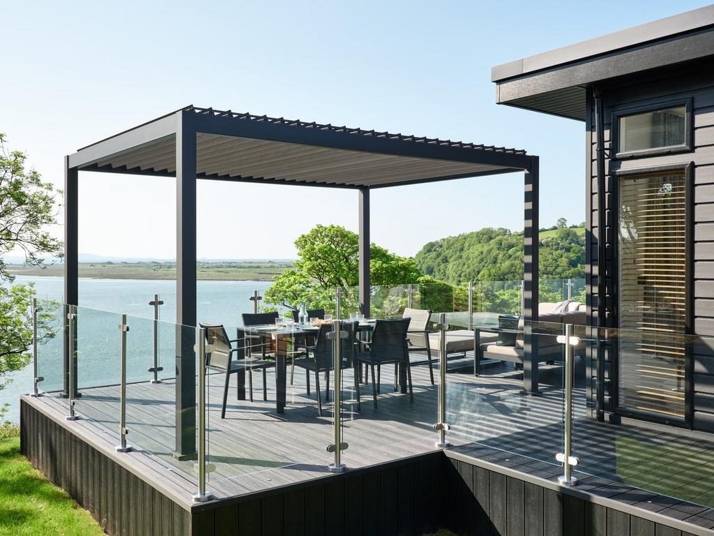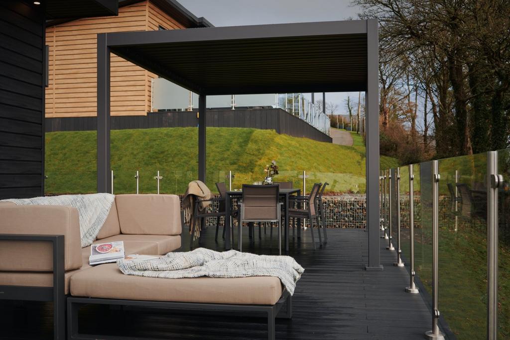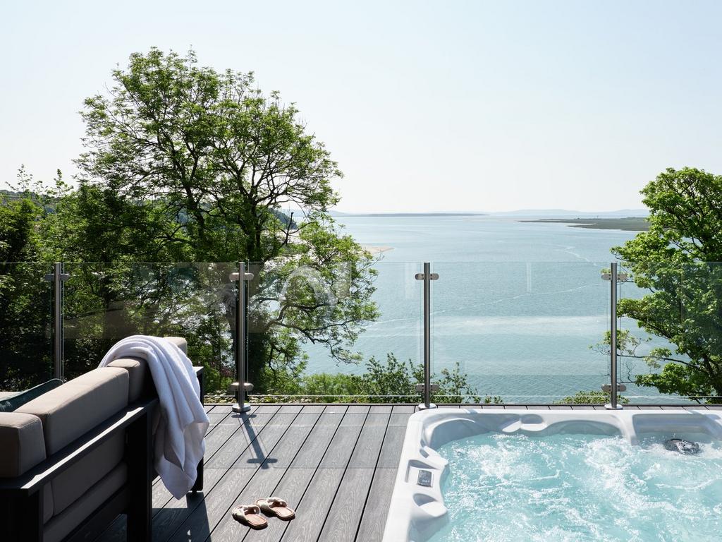 Fully glazed front elevation onto terrace area: Hot tub, outside furniture and pergola all included overlooking sea views.