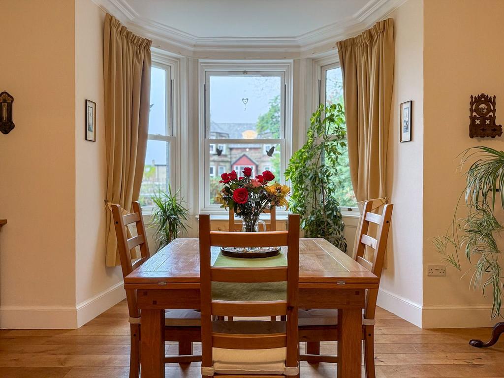 A bright and spacious front facing dining room with a bay window. This room is built for entertaining and can easily fit a large dining table. It features a fireplace with a wooden surround and slate hearth. A door leads from here to the Snug.
