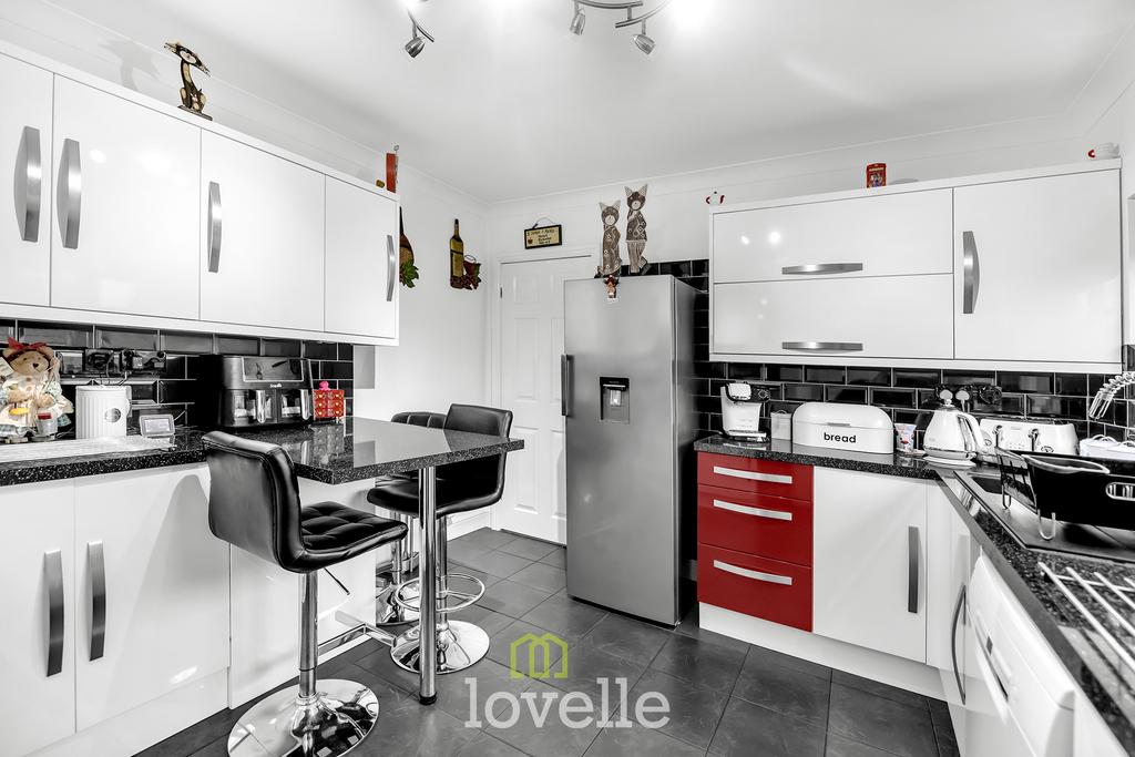 The modern kitchen is fitted with high gloss units, oven and hob, sink, and breakfast bar, together with plumbing for a dishwasher. There is also a useful laundry room, keeping household tasks neatly contained and housing a water softener (BWT).