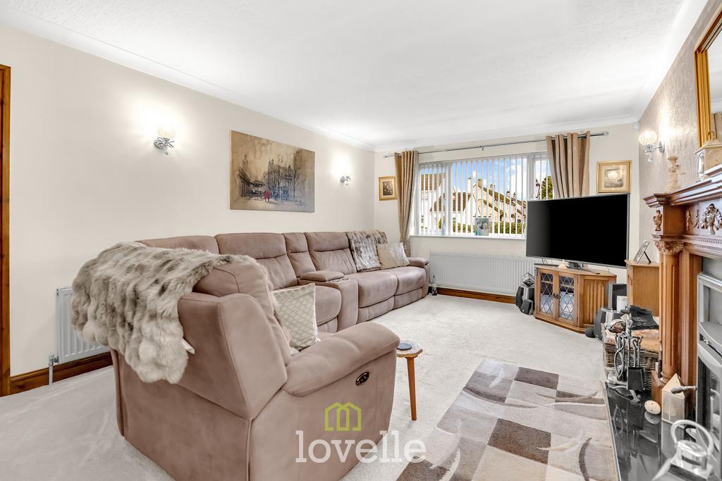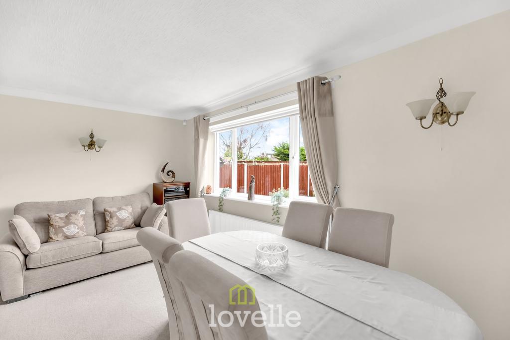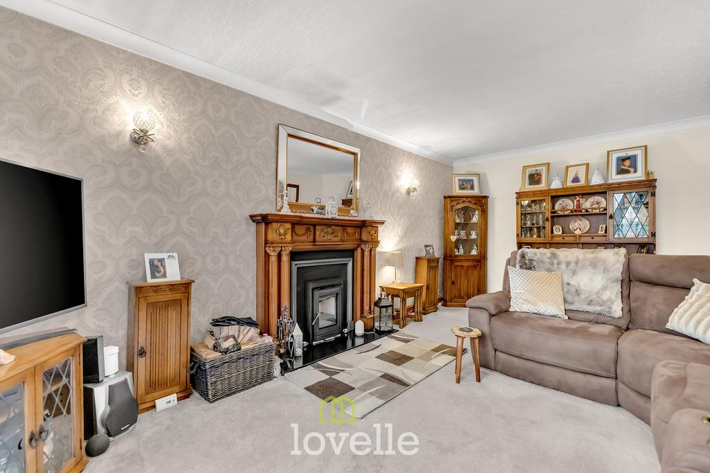 A spacious and welcoming hallway with return stairs to the first floor provides an immediate sense of space. Off the hall is a cloakroom with WC and sink. The main lounge is tastefully decorated and features a log burner with surround, creating a comfortable focal point. A separate, spacious dining room offers flexibility for family mealtimes and entertaining.