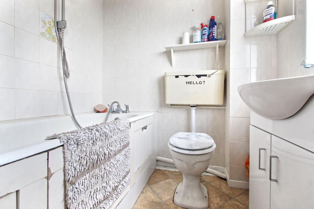 Family bathroom with bathtub and overhead shower, tiled walls, storage cabinet and a window providing natural ventilation and light.