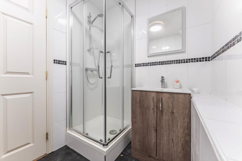 Serving guests and the second bedroom, the main bathroom includes a fully tiled finish, a corner glass shower cubicle with sliding doors, a pedestal basin, a WC, and a heated towel rail for comfort and convenience.