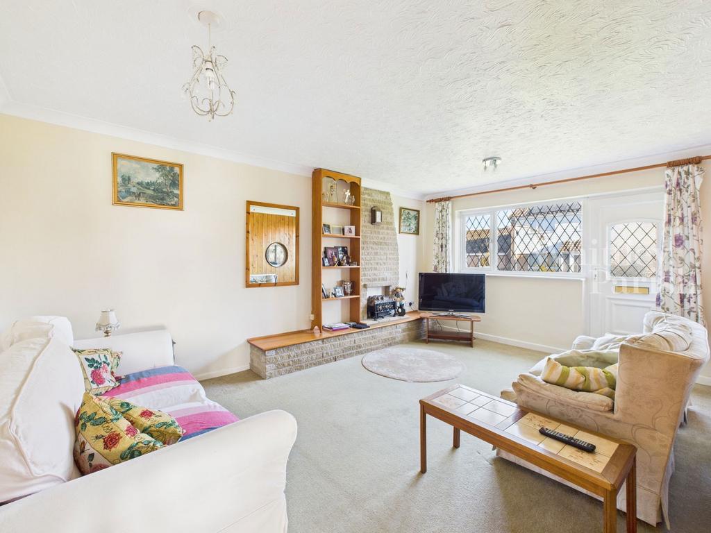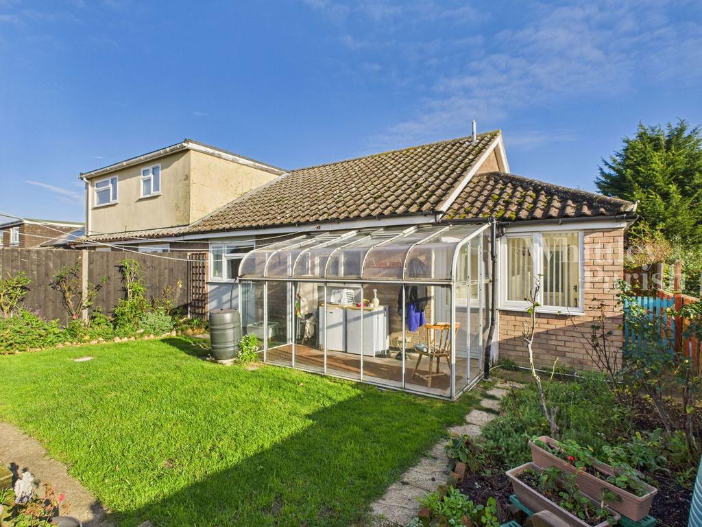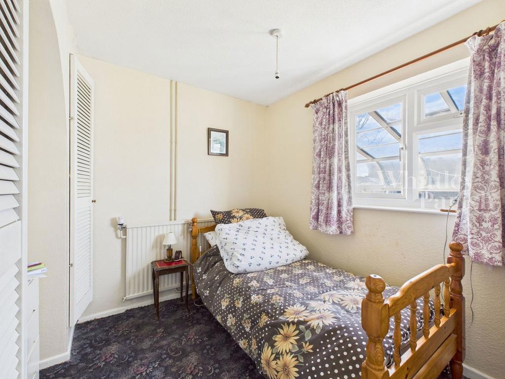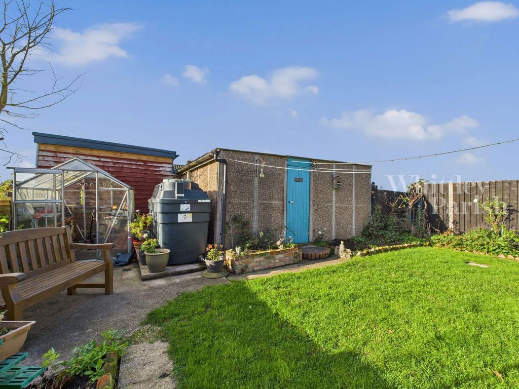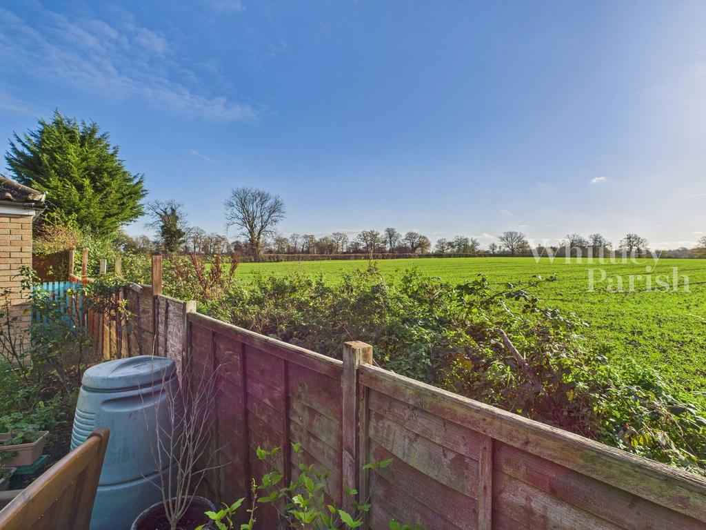Approached via a walkway, the property sits tucked away at the end of the path and siding onto open fields that provide an enjoyable taste of the countryside. The front garden is mainly laid to lawn, offering an excellent blank canvas for any gardening enthusiast. A side gate leads to the main rear garden, which is also mostly lawn, complemented by well-stocked flowerbed borders. A shed with power provides useful additional storage, alongside the single garage, which can be accessed through a pedestrian side door. In front of the garage, there is space to park one vehicle.
