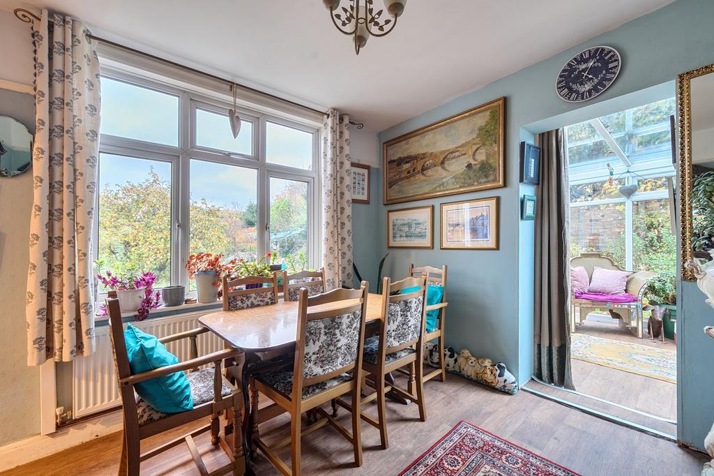 Inside, a welcoming hall leads to the sitting room, kitchen, WC and stairs. The sitting room features an open fireplace, picture rail and a pleasant front outlook. At the rear, the kitchen and dining room create a practical, sociable space, with the kitchen offering traditional units, a range-style oven and garden views. The dining room, with period details, opens into a bright conservatory overlooking the grounds.