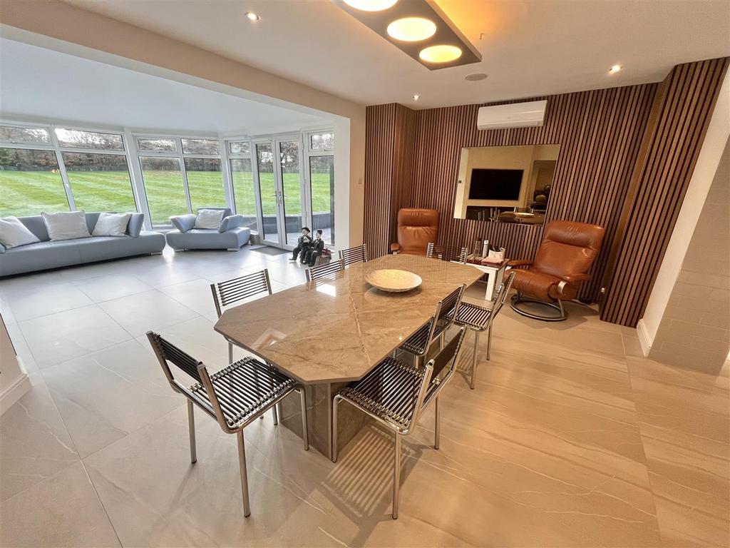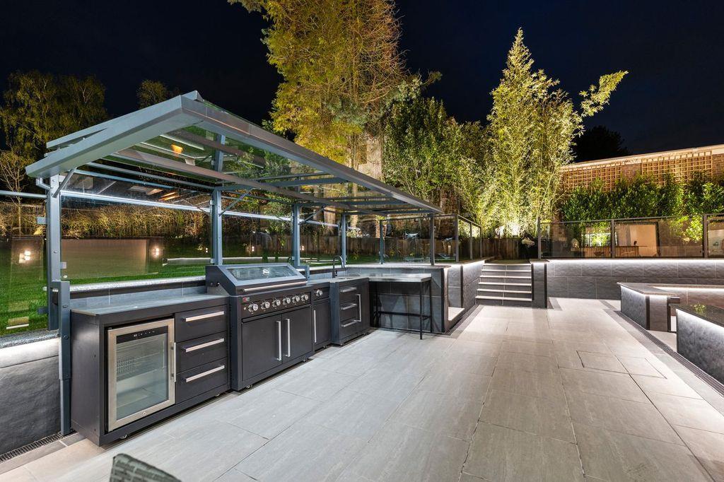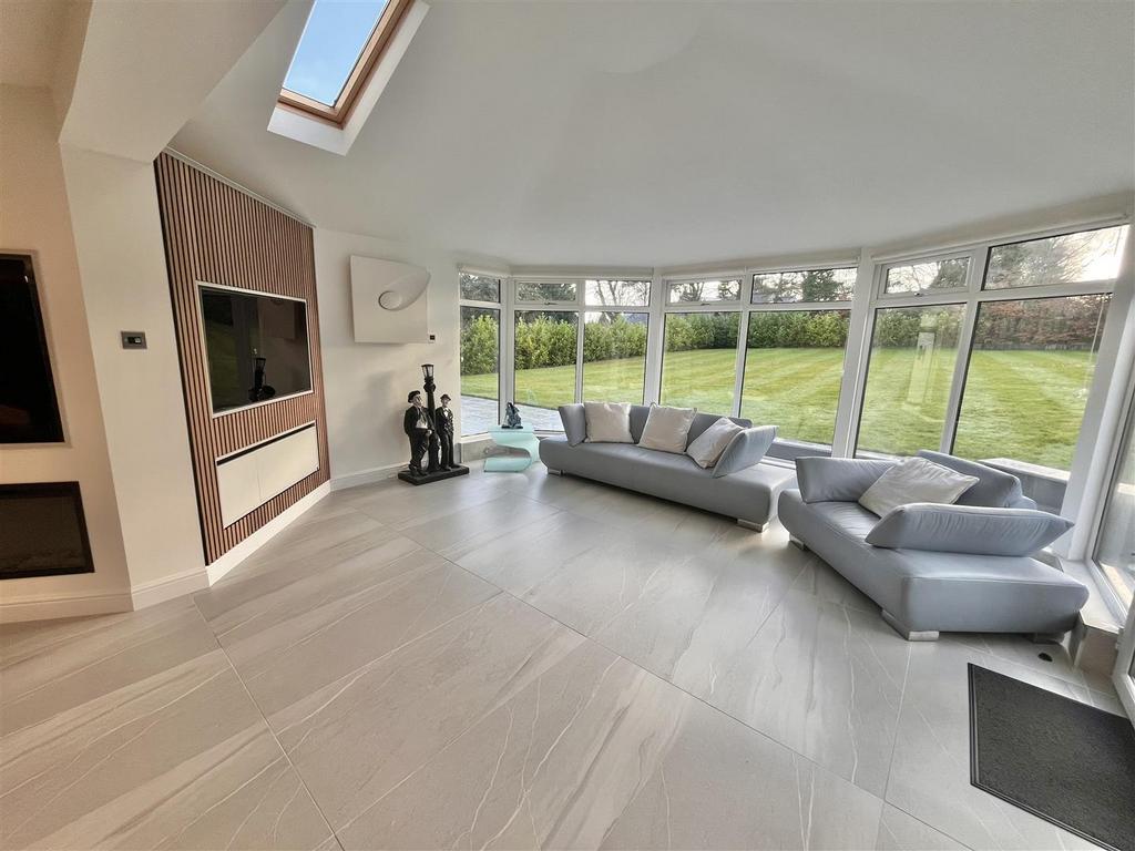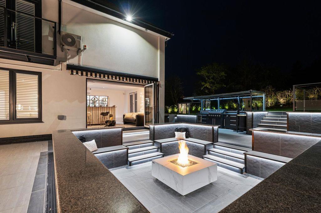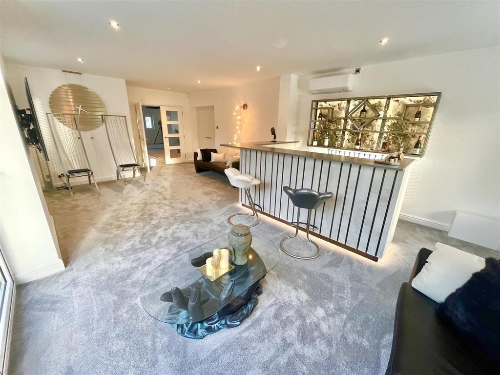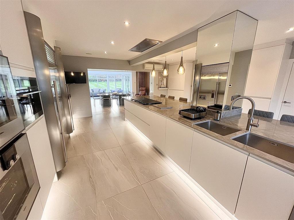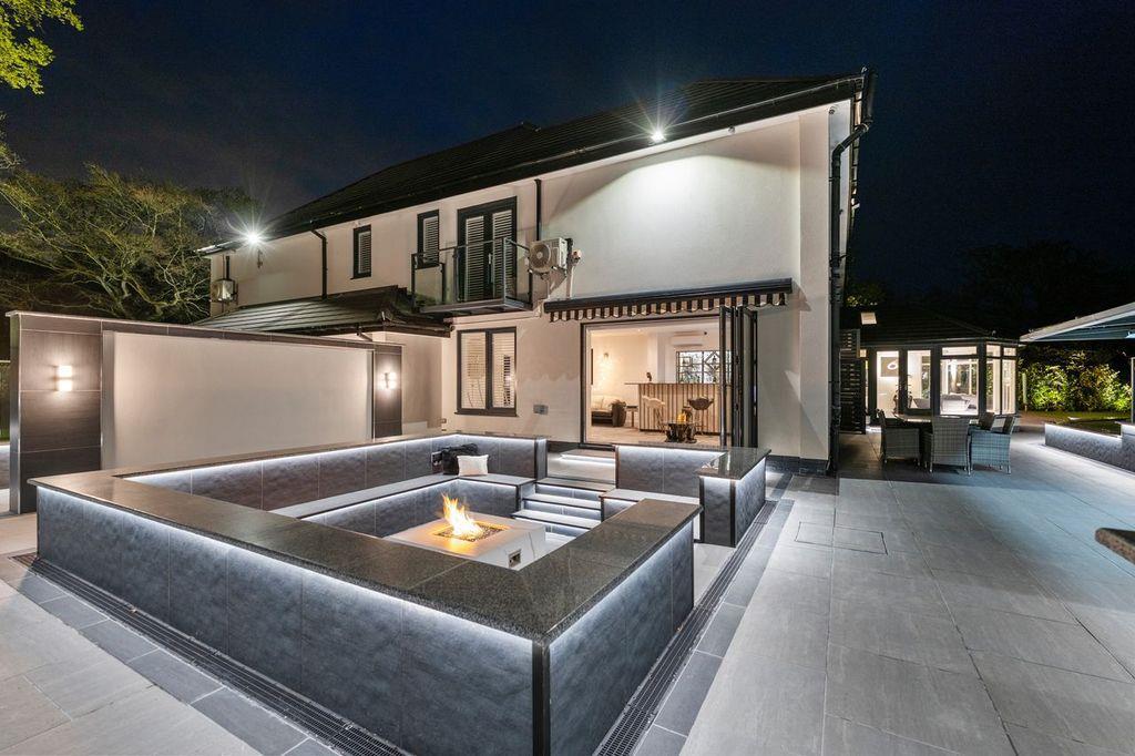 Approached via a securely gated entrance the illuminated driveway provides ample parking & access to the integral double garage. On entry to the property, you are greeted by an impressive & spacious reception hallway. Progressing through the ground floor the high specification, sleek & meticulously maintained accommodation continues. The internal remodelling is completely on show with the property boasting an expansive open plan kitchen, dining & family room ideal for entertaining. Additionally, to the ground floor there is a spacious living room with views towards the rear garden. The spacious ground floor accommodation continues with a formal dining room, study, downstairs WC, utility room & an impressive entertaining room which comprises a bar with bi-folding doors revealing a spectacular barbecue area with sunken seating & central fire pit. A perfect & private space for al-fresco dining, even into the late evening. The ground floor has been designed to facilitate separation between spaces whilst equally catering for that modern open plan free flowing space we all desire.