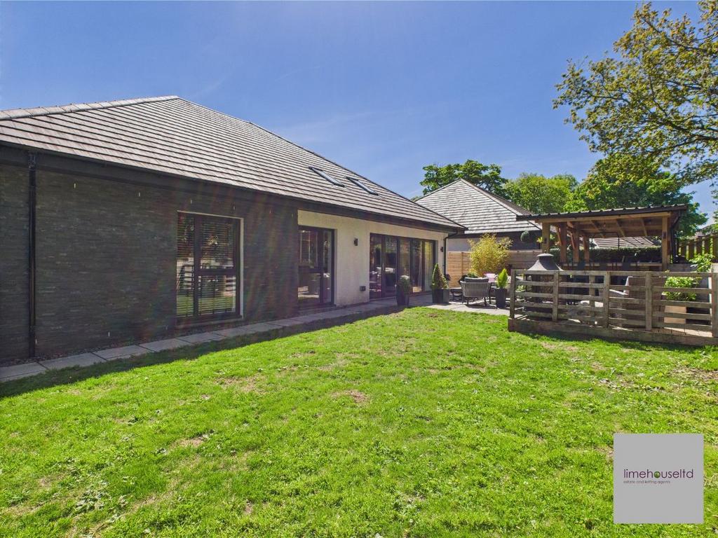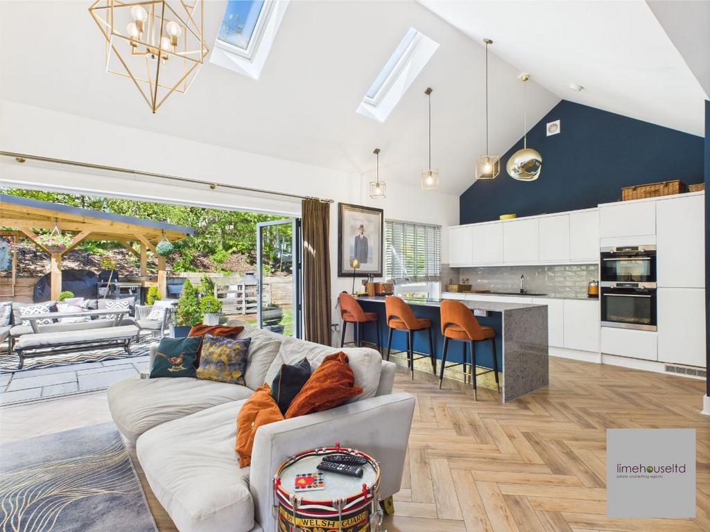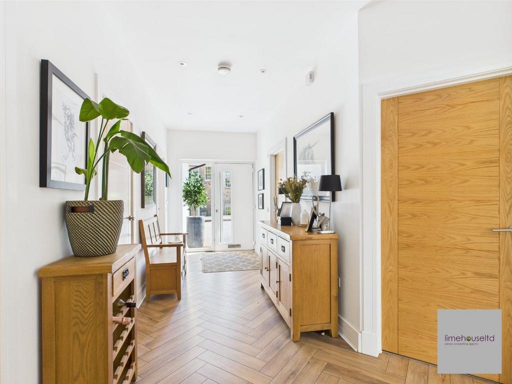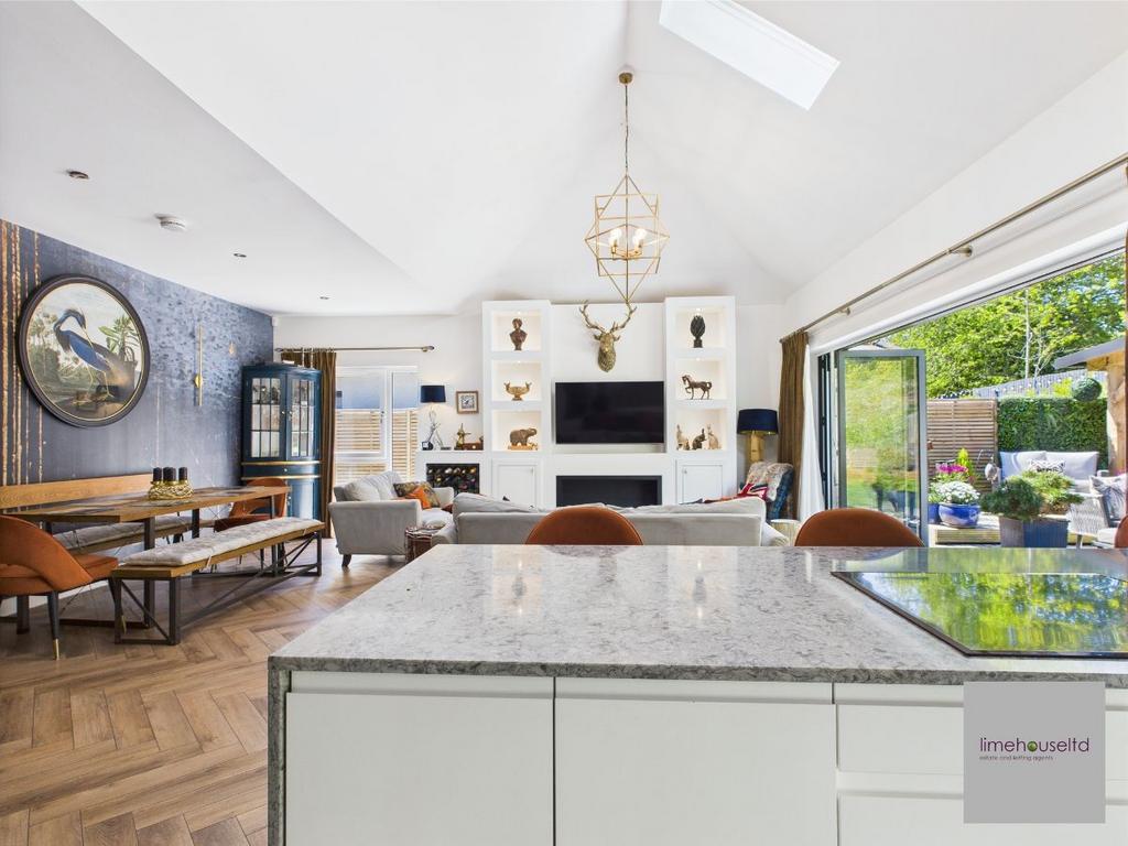 Upon entering, you are welcomed into a bright and spacious hallway that leads seamlessly into the beautifully presented living room, dining area, and kitchen. The living space features stylish bi-fold doors, flooding the room with natural light and providing direct access to the garden. The contemporary, fully fitted kitchen is complete with integrated appliances, a central island ideal for sociable dining, and elegant marble work surfaces throughout. From the kitchen, a useful utility room provides additional storage and internal access to the garage.