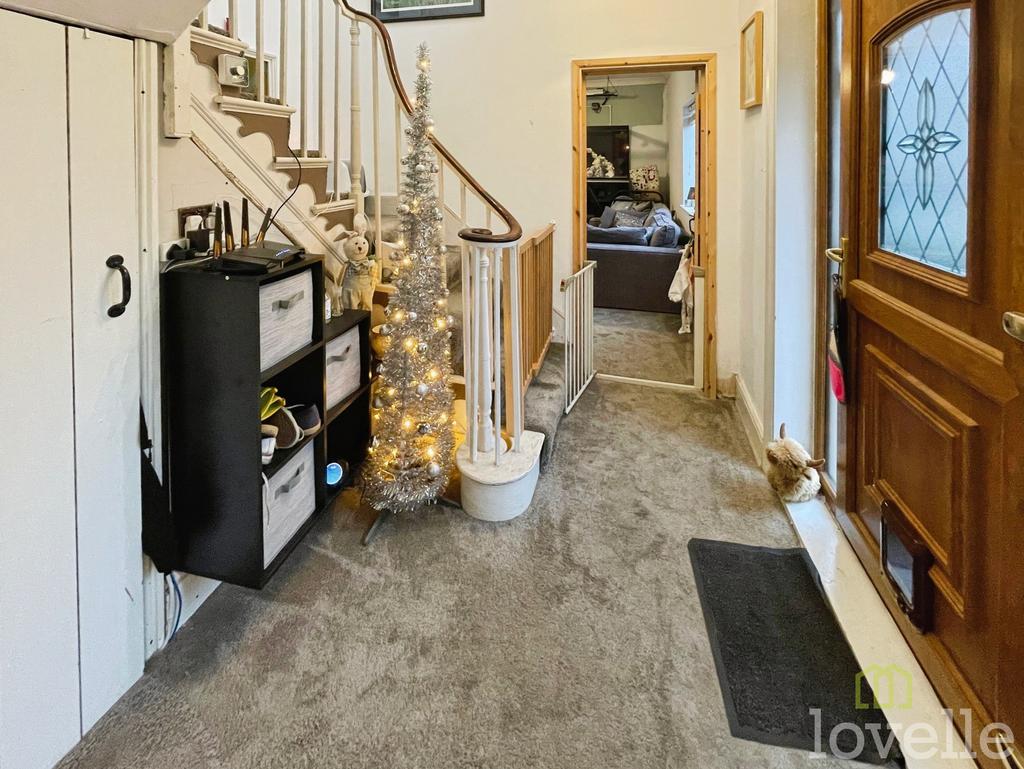 Fitted carpet, radiator, doors to lounge, under-stairs cupboard and basement, bedroom four/snug and stairs to first floor.