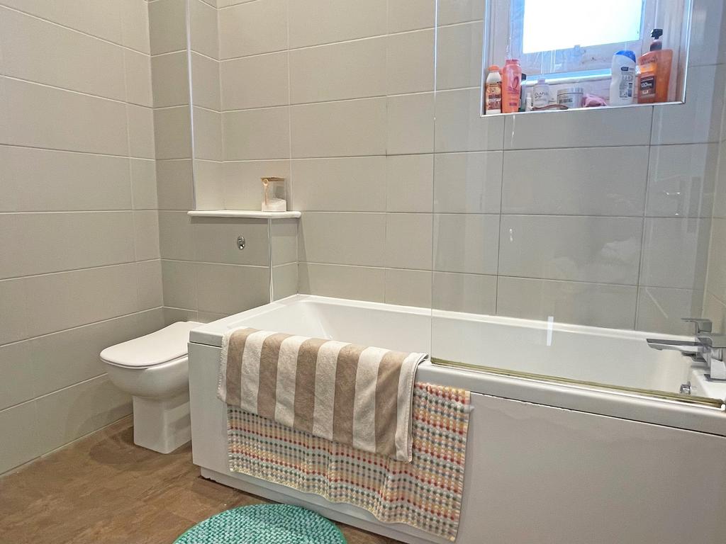 Modern contemporary style bathroom with fully tiled walls and white suite comprising panelled bath with mixer tap with fitted shower over with large rain shower head. Low level wc with concealed cistern. Wall hung wash hand basin with mono tap and cupboard below. Chrome heated towel rail. Recessed downlights. Double glazed window to rear.