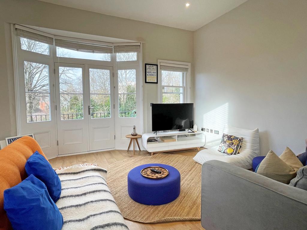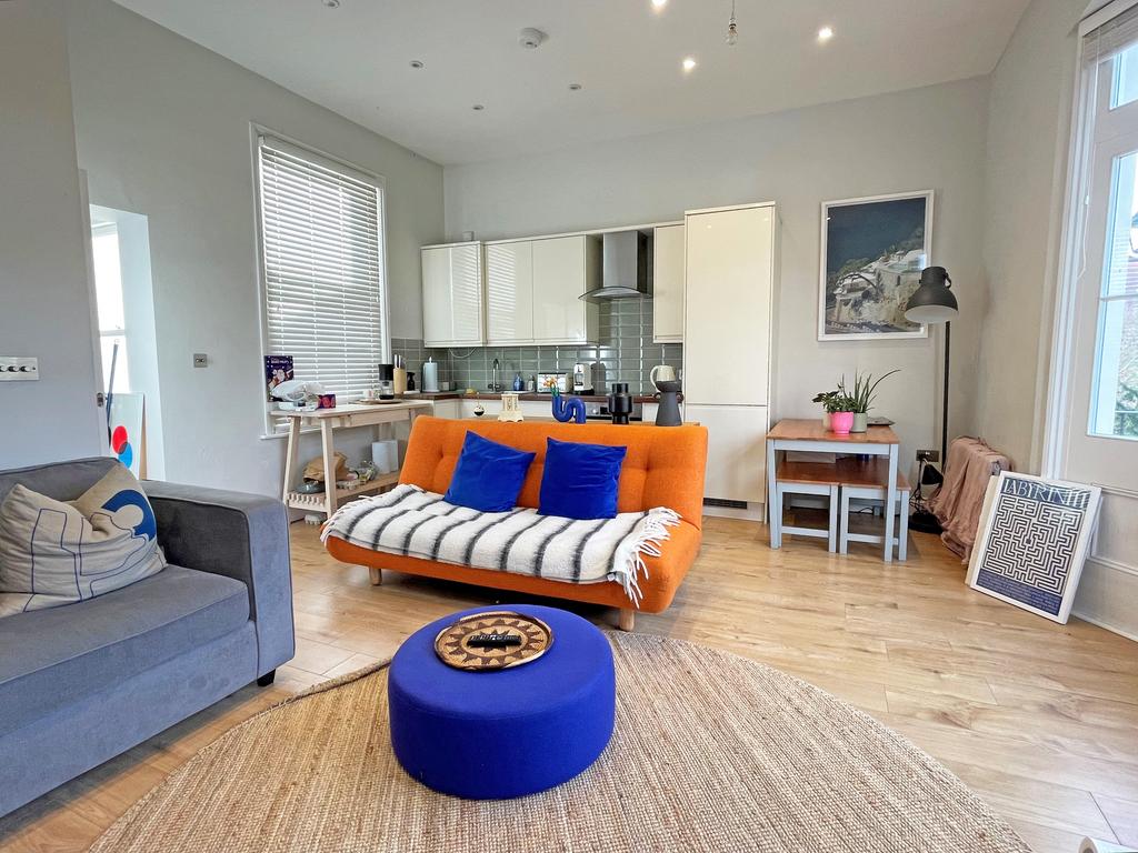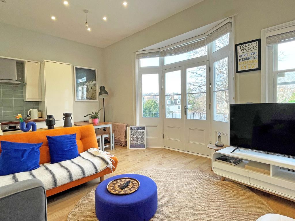 A spacious living room enjoying a bright double aspect with doors leading onto a small balcony and with a modern open plan kitchen.
