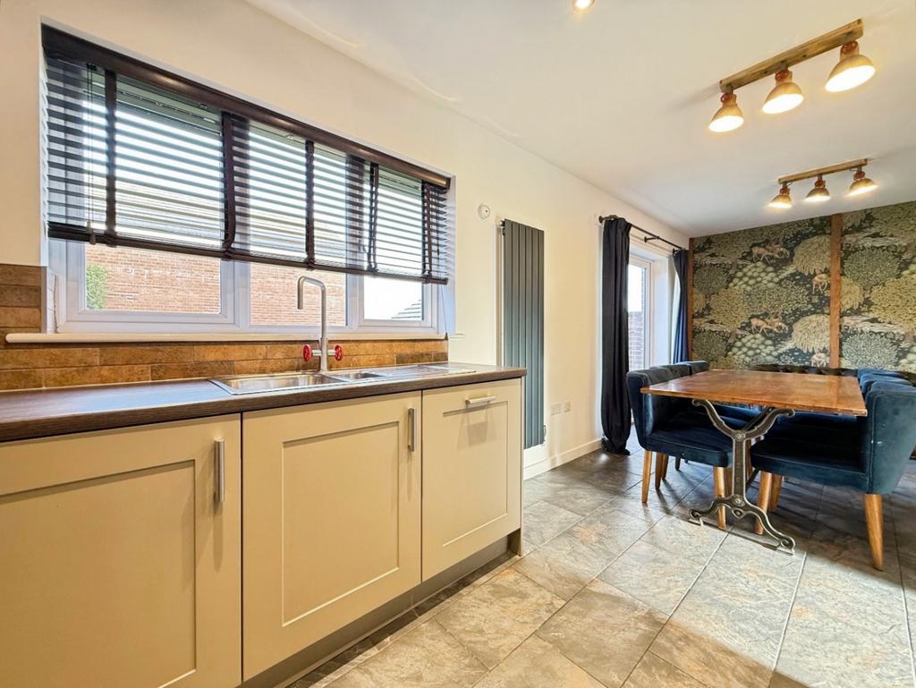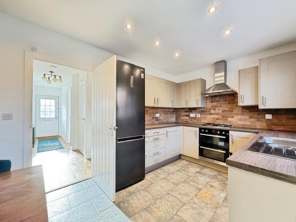 Fitted with an upgraded range of modern wall and base units with complimentary work surface over, stainless steel 1 and 1/2 bowl sink with drainer, integrated washing machine, integrated dishwasher, space for fridge/freezer, four ring gas hob with extractor fan over and oven and grill under, uPVC double glazed window to rear elevation, uPVC double glazed patio doors, tiled flooring, tiled splashback, anthracite grey vertical radiator x2, wall mounted gas combination boiler in concealed wall unit, spotlights to ceiling.