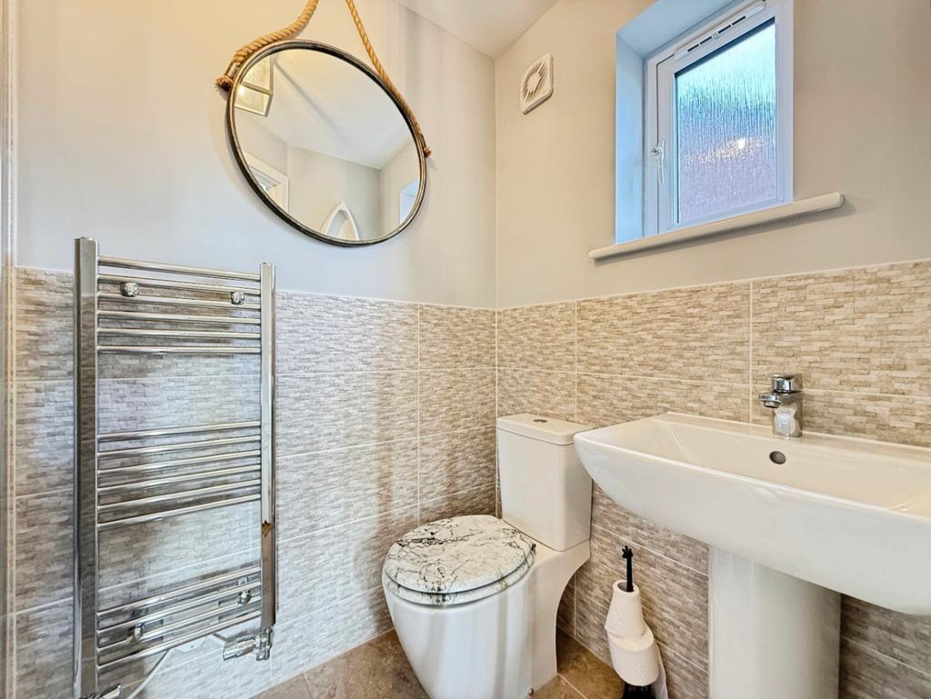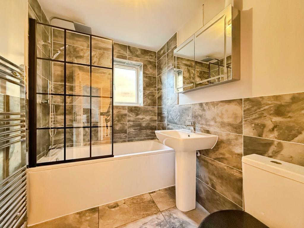 Fitted with a white three piece suite comprising of walk in shower, W/C and pedestal wash hand basin, party tiled walls, tiled flooring, radiator, extractor fan, obscure uPVC double glazed window to side elevation.