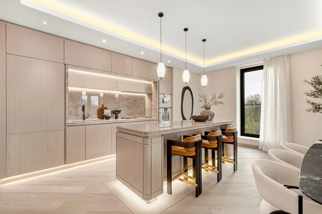 The large living and dining areas enhance the open feel of the space with the internal ceiling heights in the principal rooms ranging from nine to over ten feet, contributing to the airy atmosphere. Furthermore, the apartment boasts floor-to-ceiling windows allowing plenty of natural light and has been exquisitely interior designed by Miaki Design Studio.