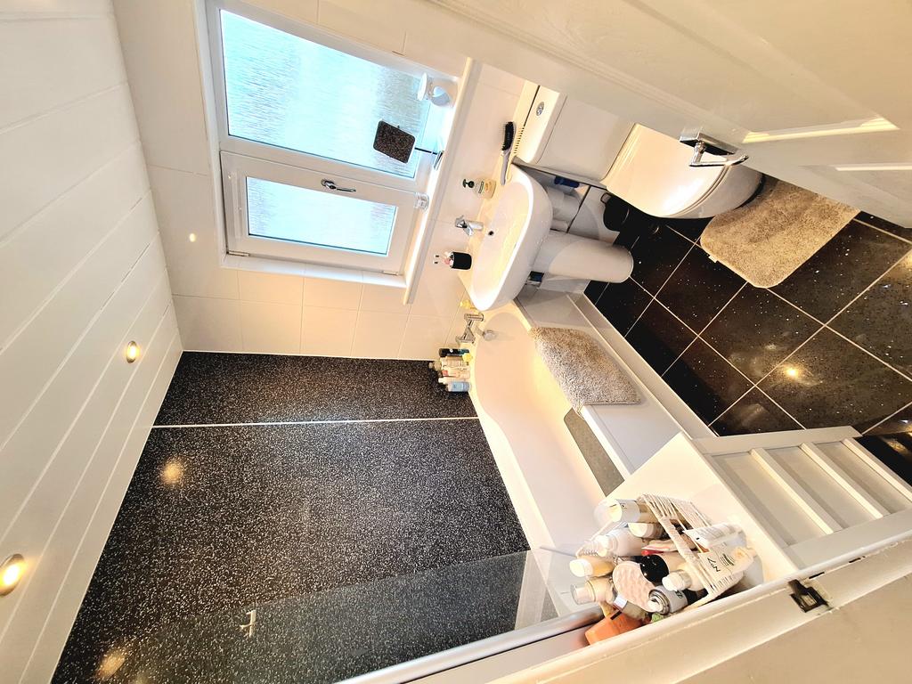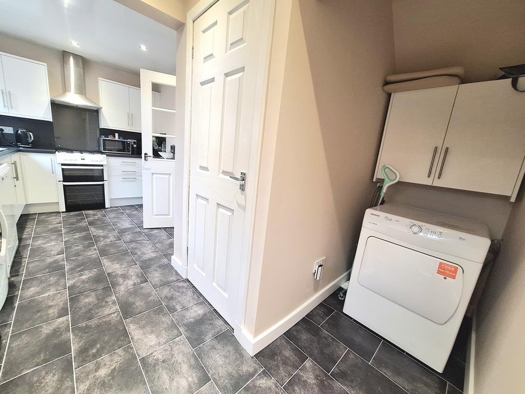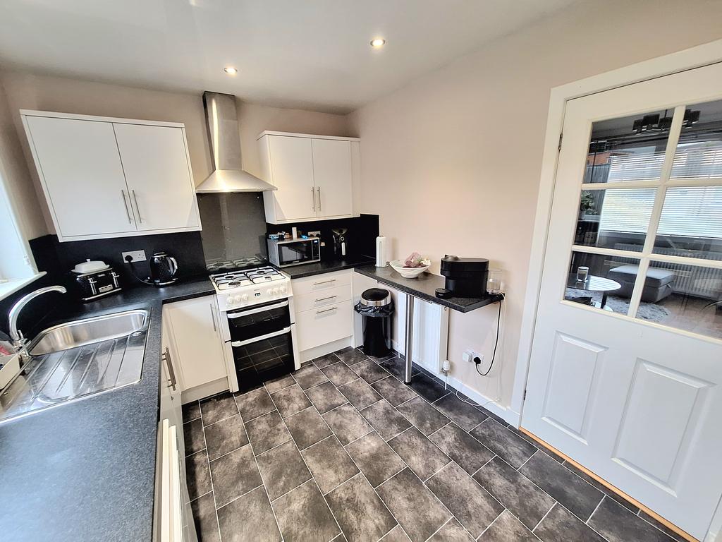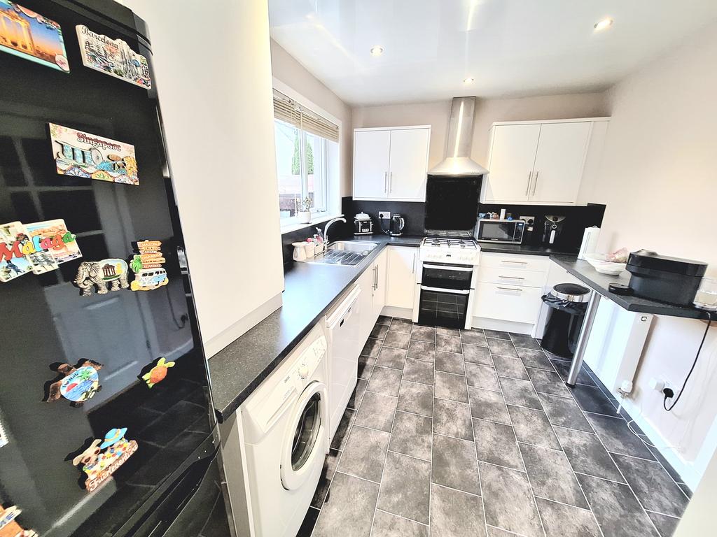 Comprising: hallway with stairs leading to the first floor, lounge with gas fireplace and surround, large breakfasting kitchen fitted with Indesit fridge freezer, Zanussi washing machine, Beko gas oven and grill, 4 ring gas burner hob and extractor hood above. Master bedroom with double built in storage wardrobe, second bedroom is double in size with masses of room, and bathroom fitted with bath tub with shower overhead.
