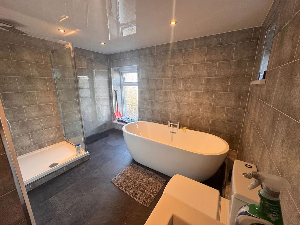 A standout feature of the property. This impressive, fully tiled bathroom boasts a freestanding oval bath, walk-in glass shower enclosure, modern vanity unit, WC and spotlights to ceiling. A spacious, high-spec room designed for comfort and relaxation.