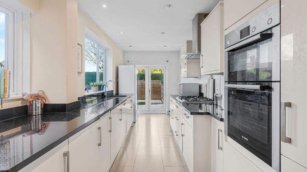 The kitchen, overlooking the garden, is full of potential. Already a warm hub for baking, homework, or a quick breakfast, there’s room here to extend and create the spacious kitchen-diner you’ve always wanted. French doors open onto the garden, making al fresco dining a breeze in the warmer months.