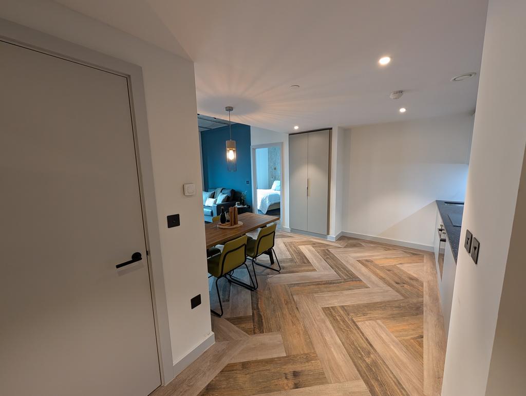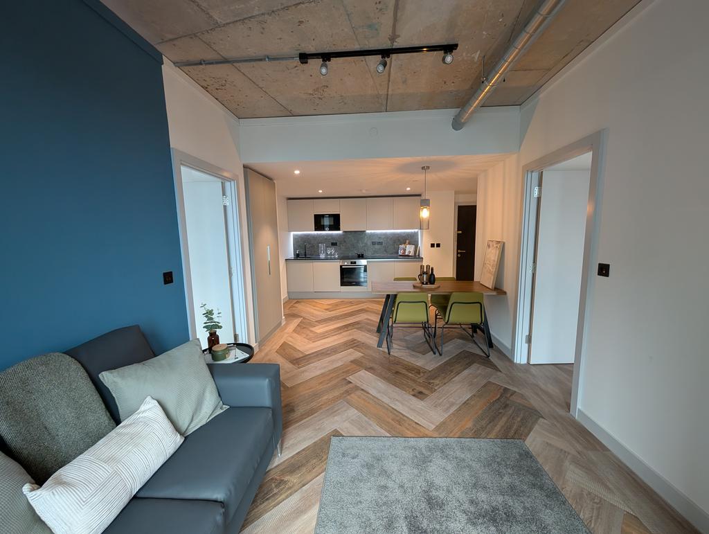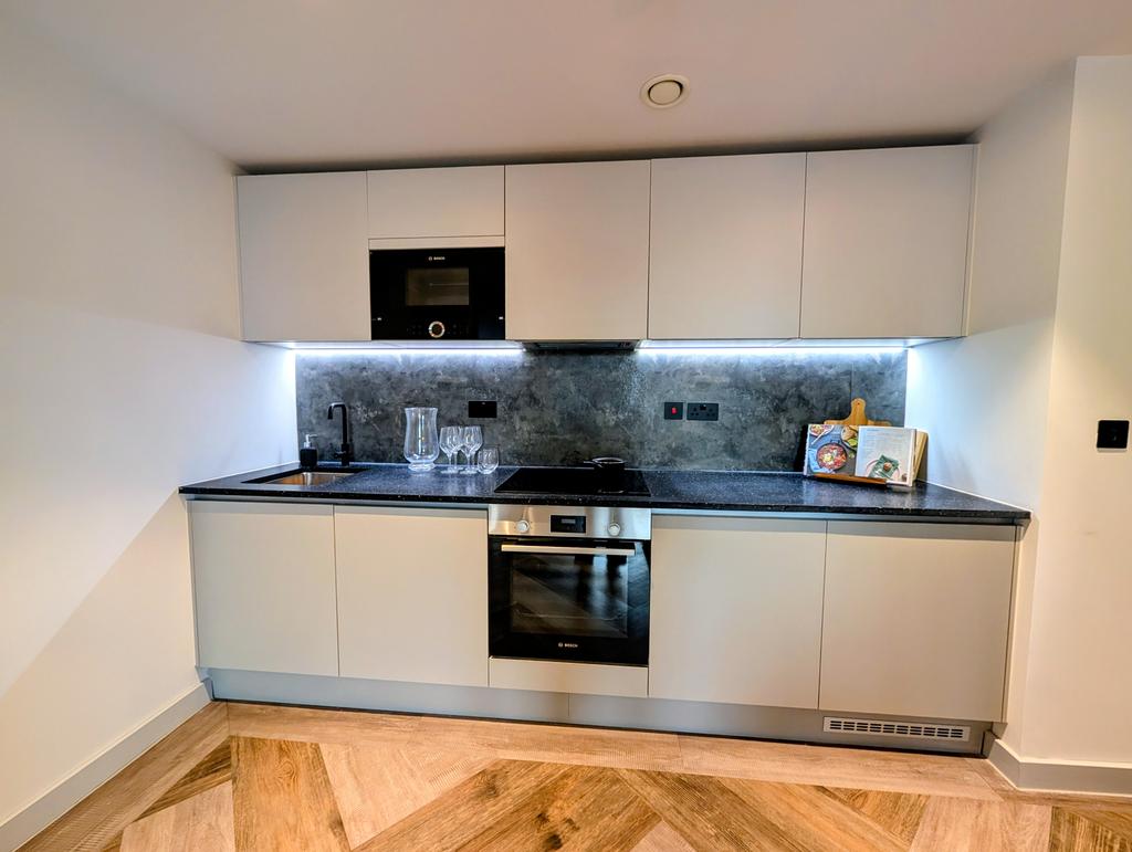 The apartment itself is finished to the highest specification, featuring bespoke furniture, exposed concrete ceilings, Minerva worktops, and Bosch integrated appliances. The heating system includes air source heat pumps with underfloor heating, ensuring both comfort and eco-friendliness.