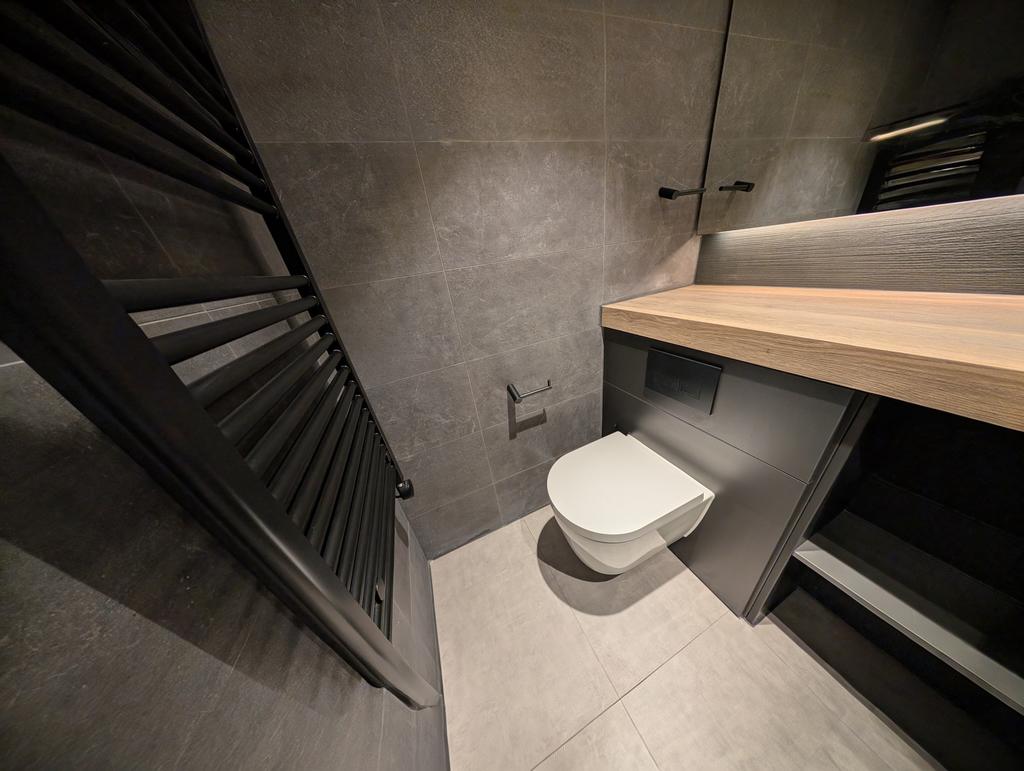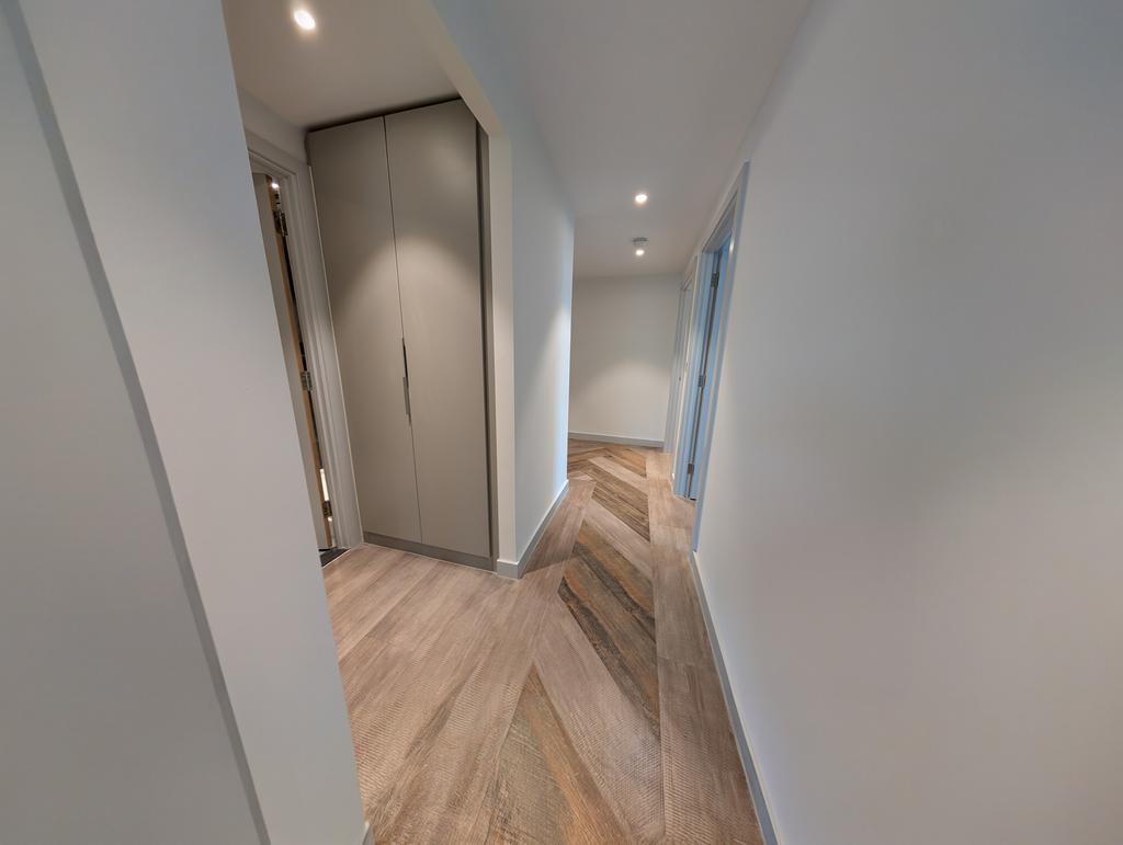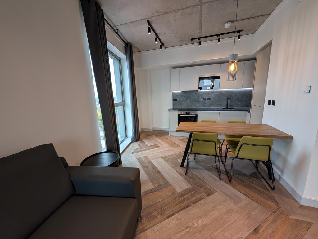 The apartment itself is finished to the highest specification, featuring bespoke furniture, exposed concrete ceilings, Minerva worktops, and Bosch integrated appliances. The heating system includes air source heat pumps with underfloor heating, ensuring both comfort and eco-friendliness.