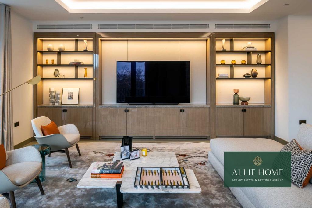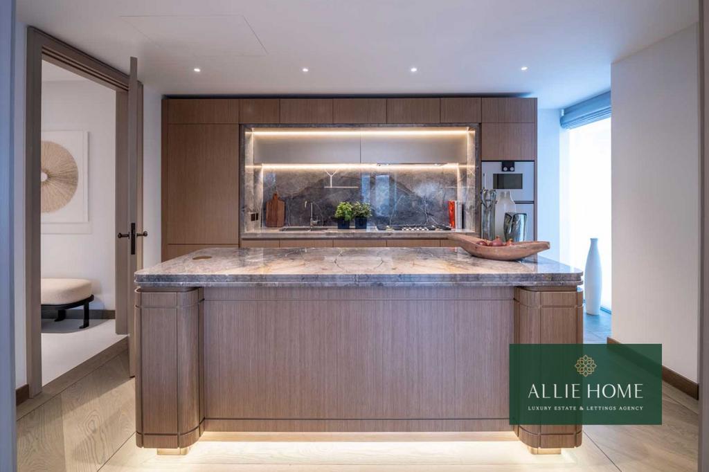 This magnificent 2,437 sq ft three-bedroom, three-bathroom apartment defines modern luxury, offering panoramic views over Hyde Park and Kensington Palace Gardens. Expansive floor-to-ceiling windows flood the space with natural light, enhancing the seamless flow between open-plan living and dining areas. The bespoke kitchen, finished with Gaggenau appliances, premium materials, and elegant craftsmanship, complements the refined interiors and meticulous detailing throughout the home.