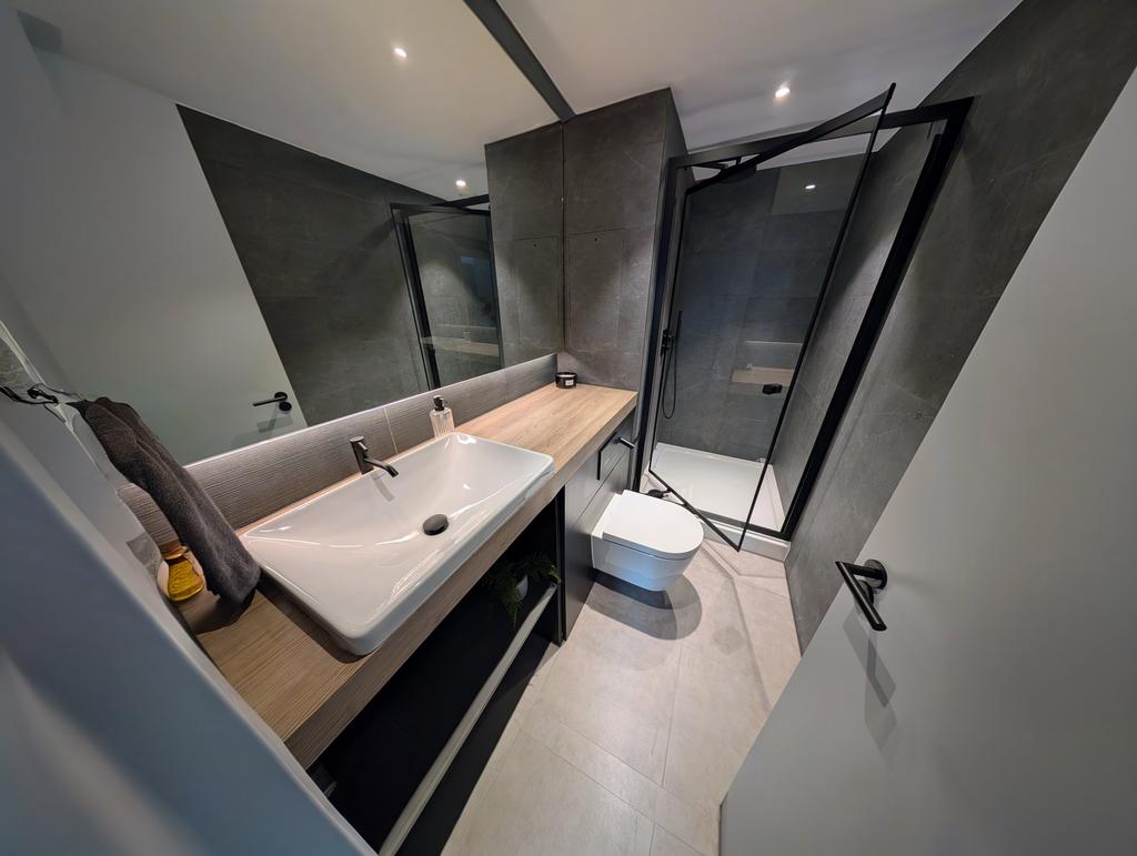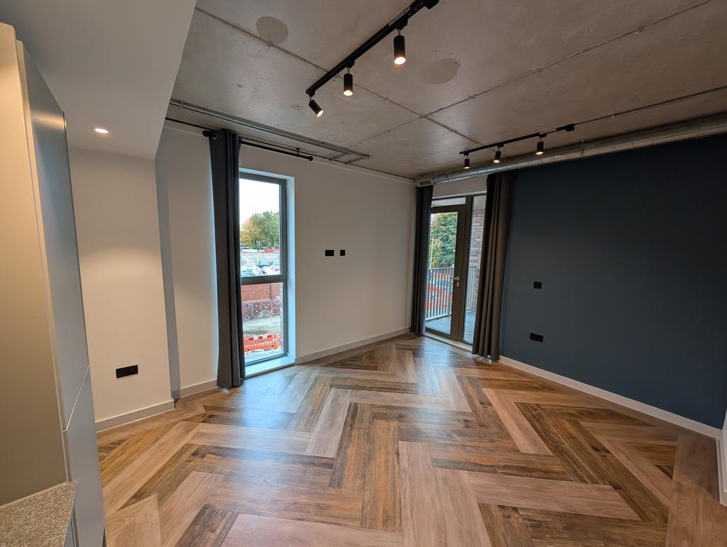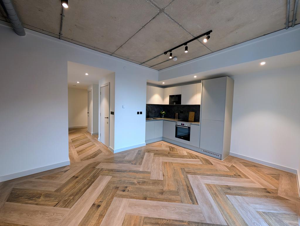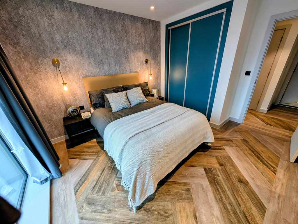 The apartment itself is finished to the highest specification, featuring bespoke furniture, exposed concrete ceilings, Minerva worktops, and Bosch integrated appliances. The heating system includes air source heat pumps with underfloor heating, ensuring both comfort and eco-friendliness.