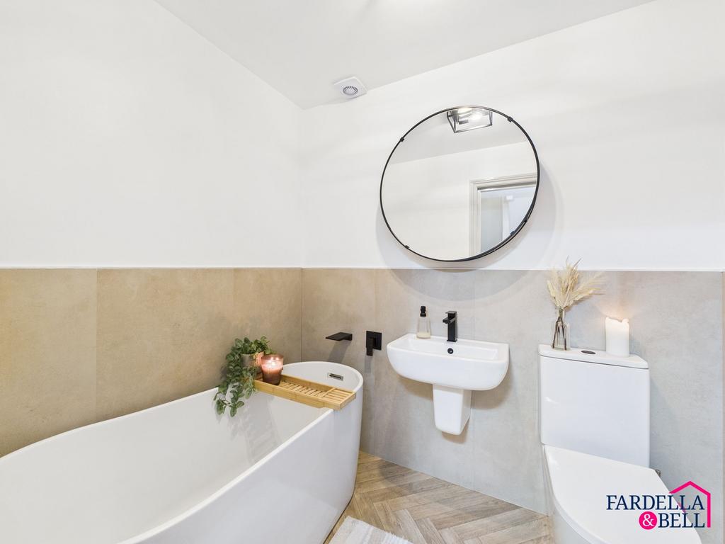 Ascending to the first floor, the spacious bedrooms are thoughtfully designed to maximise size. The main bedroom offers dual wooden doors provide access to additional storage & ensuite options and the other bedrooms follow suite with style and size. The bathrooms are finished to an exceptional standard, with a luxurious freestanding bath-tub and contemporary fixtures.