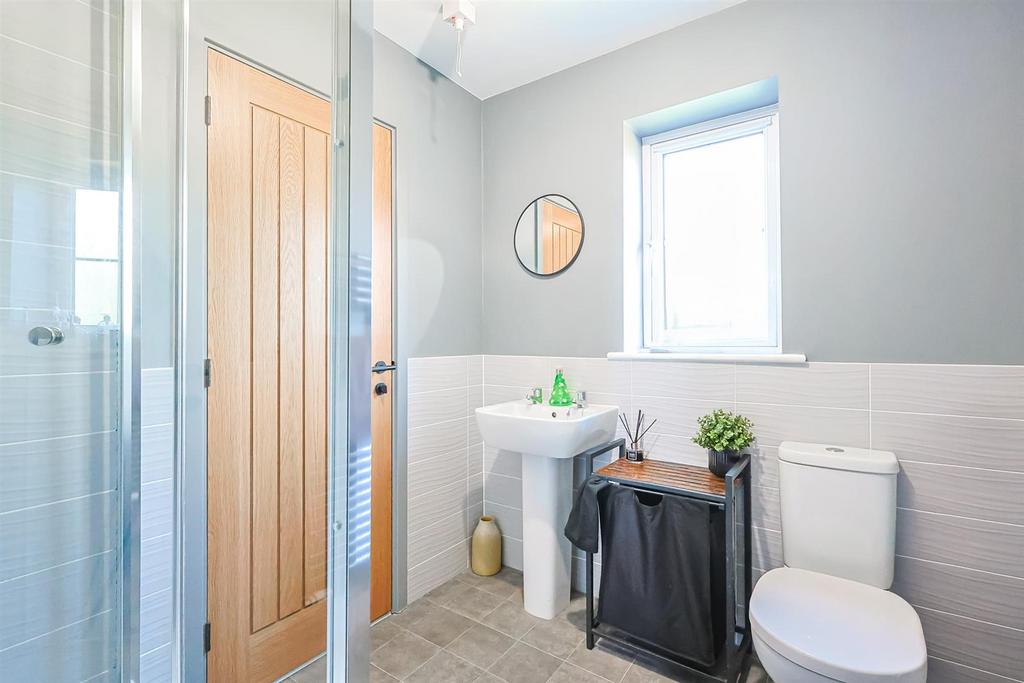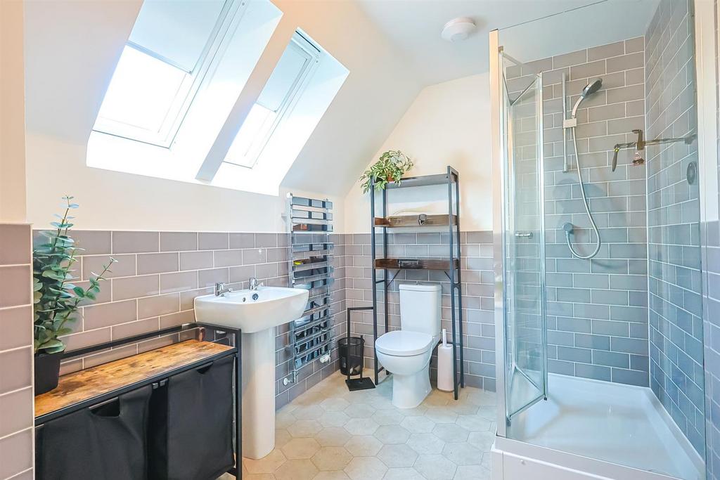 Ensuite - 2.16m x 3.02m (7'1 x 9'11) - Ceiling mounted light fitting, double velux window to rear, part tiled walls, bath unit, shower unit, heated towel rail, wash hand basin and low-level WC. Vinyl flooring throughout.