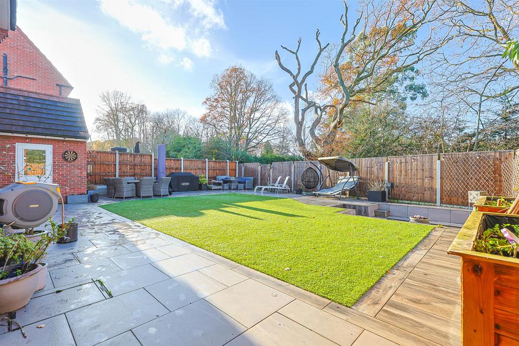 Rear Garden - Access from kitchen/dining area. Complete patio area surround with Astroturf grass to centre. Love fire pit area with seating, back gate, access to detached garage, shed with power and lighting to one side and side access to the other side.