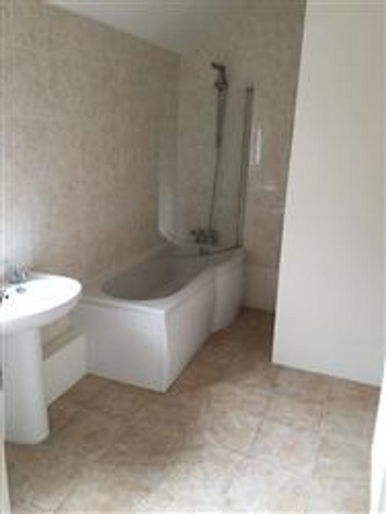White 3 piece suite with shower over bath. Neutral decor. Complimentary Wall tiling. Storage cupboard housing combi boiler. Wall mounted radiator