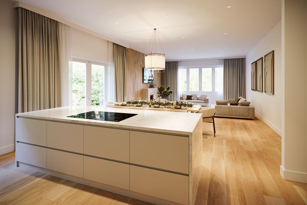 The accommodation as planned has been thoughtfully designed to blend in with the interesting topography of the site, main reception rooms and the large and impressive open kitchen/dining/family room with direct garden access. There are four reception rooms in all including a large lounge, second sitting room or snug and a large study all on the ground floor, and the wonderful central hub kitchen family area is at a half level above, accessing the garden all around. In all there are five large bedrooms, the main and guest suites with dressing rooms and bathrooms, and all bedrooms are en suite, as planned.