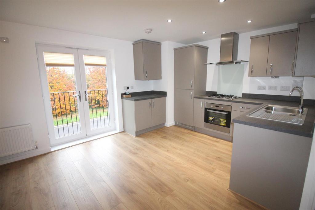 The property features a generous open-plan kitchen/living area, with the kitchen fitted with contemporary units, ample storage, integrated appliances and good counter space. The living area provides plenty of room for both relaxation and dining, with a large window and door allowing natural light to flow through and giving access to a private outdoor space.