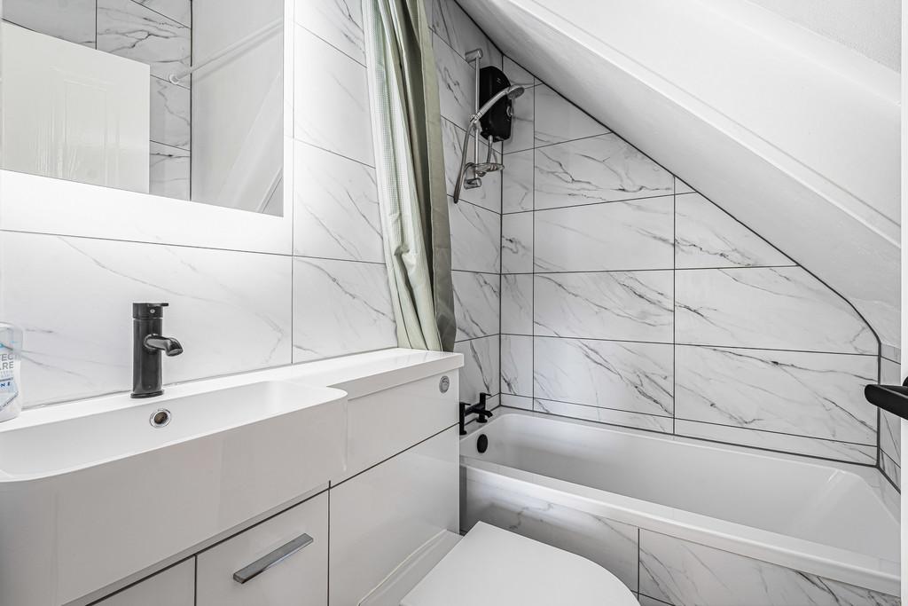 The double bedroom sits to the front of the building and includes an electric radiator and coved ceiling. The bathroom features a contemporary three-piece white suite with a panelled bath, WC and wash basin unit with work surfaces and mixer tap, tiled walls and LED illuminated mirror.