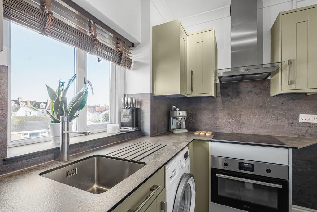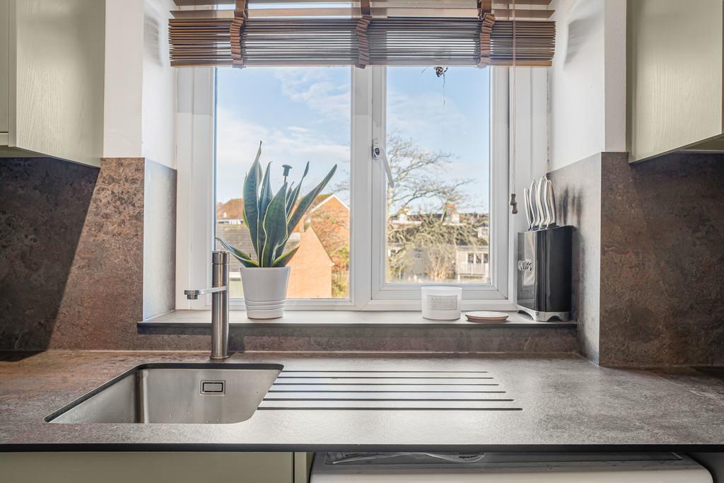 The modern fitted kitchen offers matching wall and base units, induction hob with extractor, space for appliances and a window providing an elevated outlook. With an undermount sink and mixer tap, work surfaces and matching splashbacks.