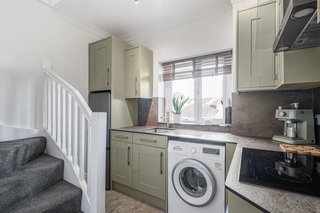 A communal reception hallway leads to the entrance of the maisonette. Inside, the accommodation begins with an inner hall and stairs rising to the main living areas. The open-plan lounge enjoys uPVC double glazed windows framing sea views. This inviting room also benefits from eaves storage.