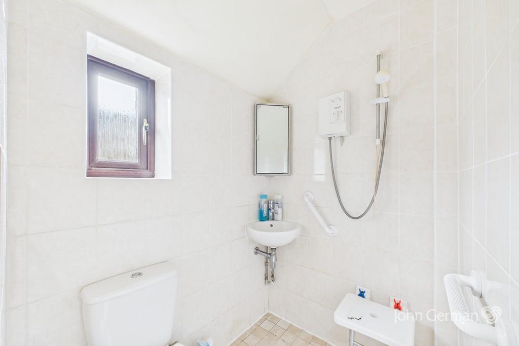 The wet room is fully tiled and fitted with a low level WC, wash hand basin with chrome mixer tap, electric shower and electric extractor fan.