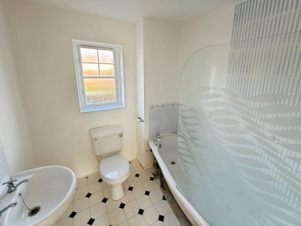BATHROOM Rear aspect window, panel enclosed bath with shower over and glass screen, wash hand basin and low level WC. Part tiled walls and tiled floor. Radiator.
