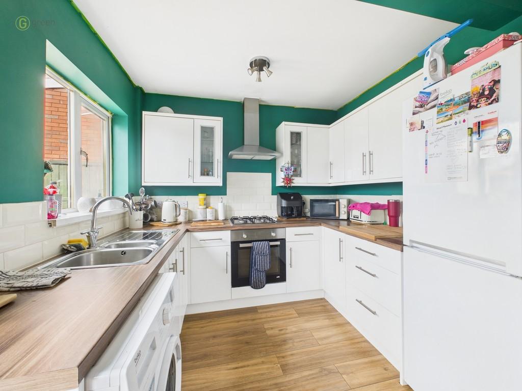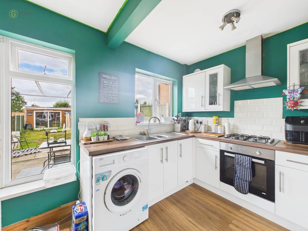 KITCHEN 16' 4" x 9' 1" (4.98m x 2.77m) Having double glazed window to rear and double glazed door leading to rear, gas central heating radiator, wall and base units, integrated oven and hob with extractor fan over, sink with mixer tap, space for washing machine and space for fridge, half tiled splash back, laminate wood flooring.