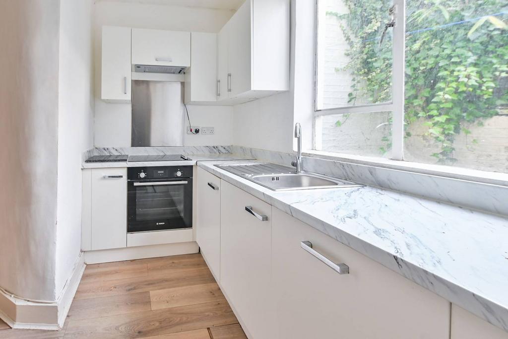 This basement 1 bedroom flat in a fantastic location offers a unique open plan fitted kitchen and modern bathroom. It includes a private well sized garden.