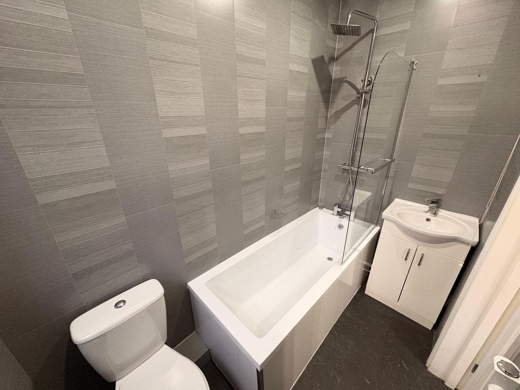 Towards the rear of the property, you'll find the modern fitted kitchen. Finished with a complimentary colour palette, wooden-effect worktops and integrated appliances, this kitchen offers excellent storage and workspace. From here, a door leads directly to the private rear yard. The family bathroom is located next to the kitchen, with WC, wash basin, and bath with overhead waterfall shower head.