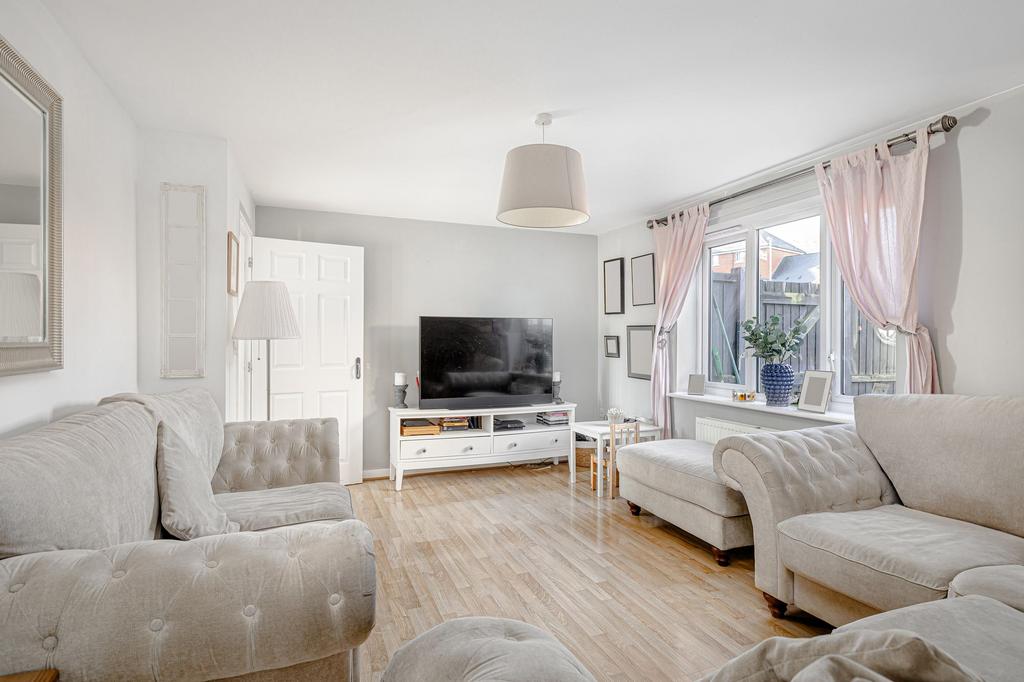 The entrance hall is fresh and light, giving an immediate sense of welcome as you step inside. To the front of the property sits a superb sitting room – a spacious, softly styled living area with wood-effect flooring and a large rear window allowing light to sweep through the space. It’s a relaxing room with ample capacity for family seating, cosy evenings and social occasions.