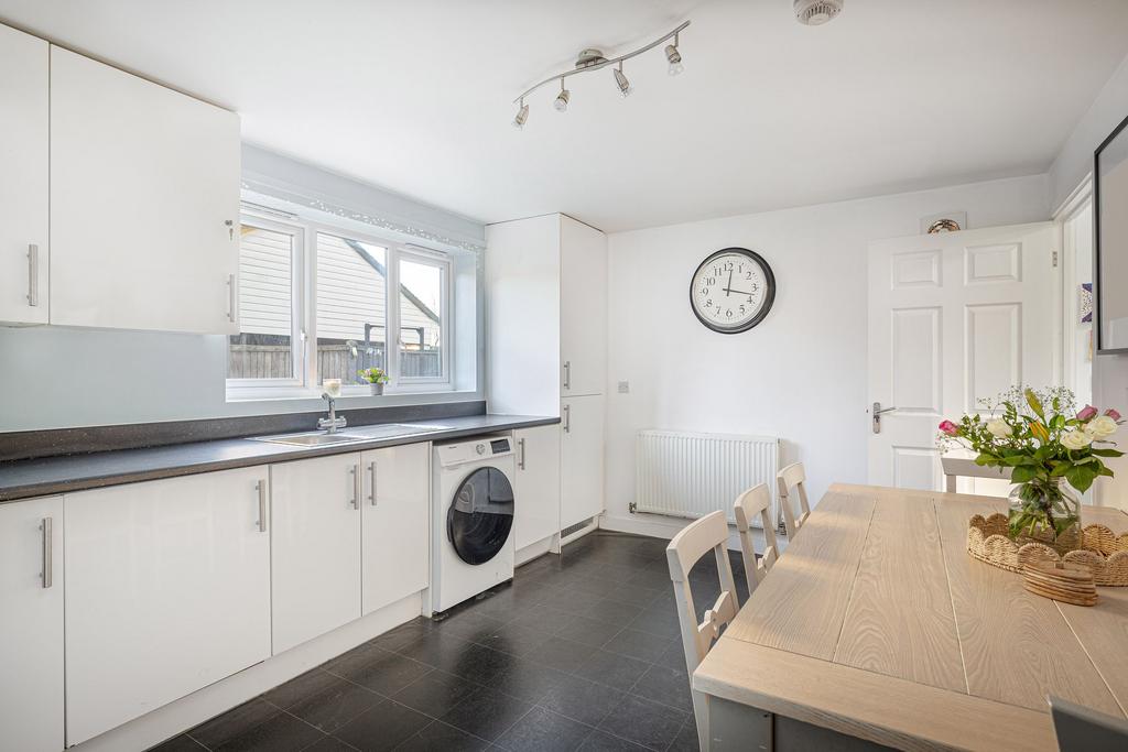To the rear, the kitchen/dining room offers excellent practicality, fitted with sleek white cabinetry, good storage and worktop space, integrated cooking appliances and room for a full dining table. The large window overlooks the garden and creates a bright and sociable everyday hub. Completing the ground floor is a well-presented WC, ideal for guests and busy family mornings.