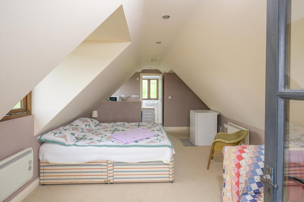 The property is approached via a long shared driveway that leads to a private drive with ample parking and a detached double garage. Above the garage is a self-contained studio annexe with a bedroom, kitchenette, and bathroom - ideal for guest accommodation, a home office, gym, studio, or similar uses.