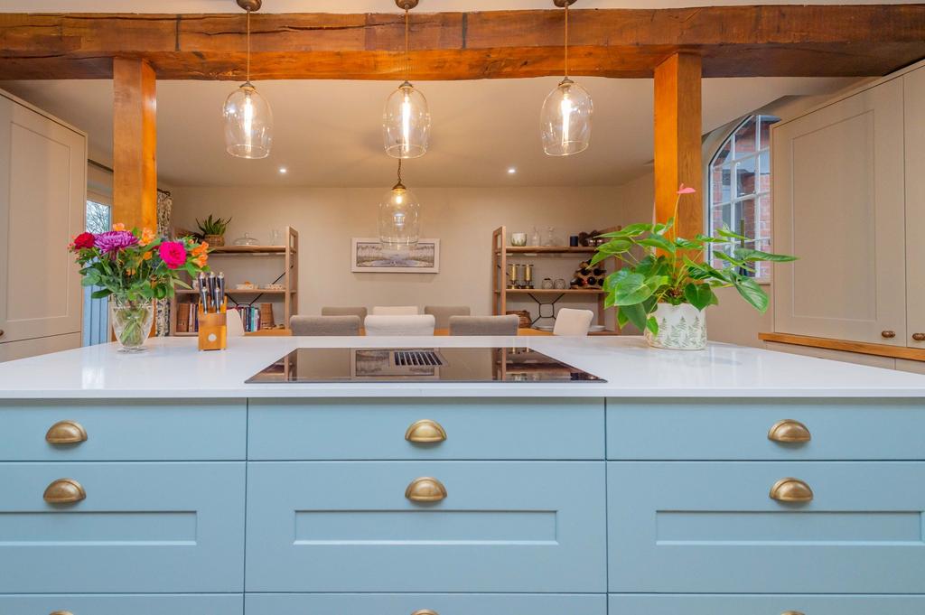 The heart of the home is the impressive and generously sized kitchen/dining area, recently enhanced by the owners with impeccable taste. This country-style fitted kitchen is perfectly harmonised with the building's character. The central island is a duck-egg blue, contrasted by cream wall units, and features a sophisticated integrated SMEG induction hob with integrated storage and a welcoming breakfast bar-perfect for casual dining or socialising while cooking. The culinary space is completed by a beautiful Belfast sink with a copper mixer tap, copper cupboard handles, integrated SMEG double ovens, and separate full-height fridge and freezer, all set against elegant white quartz worksurfaces. Exposed timber ceiling beams and full-height structural beams naturally frame the island, subtly distinguishing the culinary area from the dining space beyond.
